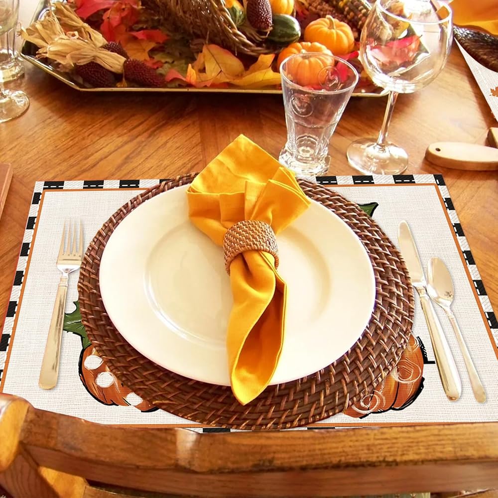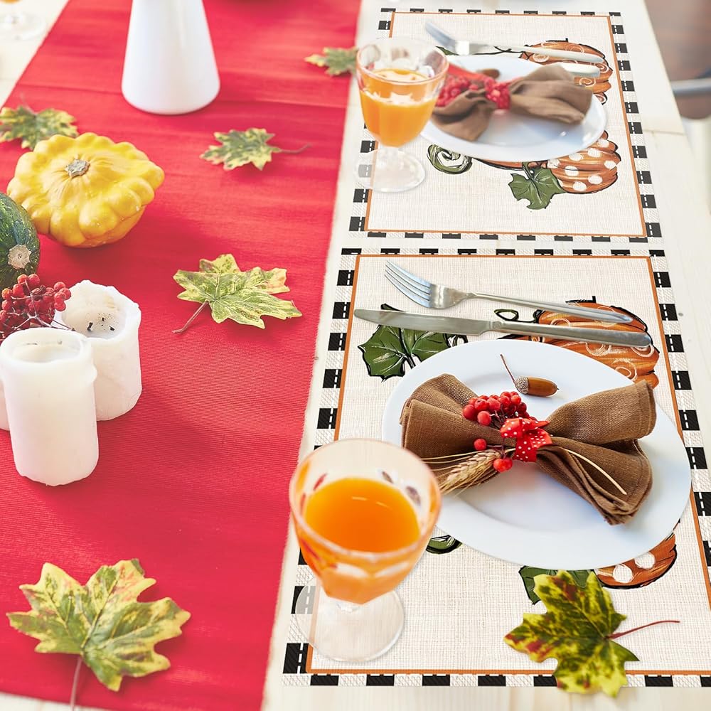 Fall Table Runner 13x72 Inch Long Linen Pumpkin Buffalo Plaid Decorations Autumn Thanksgiving Farmhouse Centerpiece Seasonal Harvest Table Mats Kitchen Dining Room Indoor Outdoor Home Party Supplies