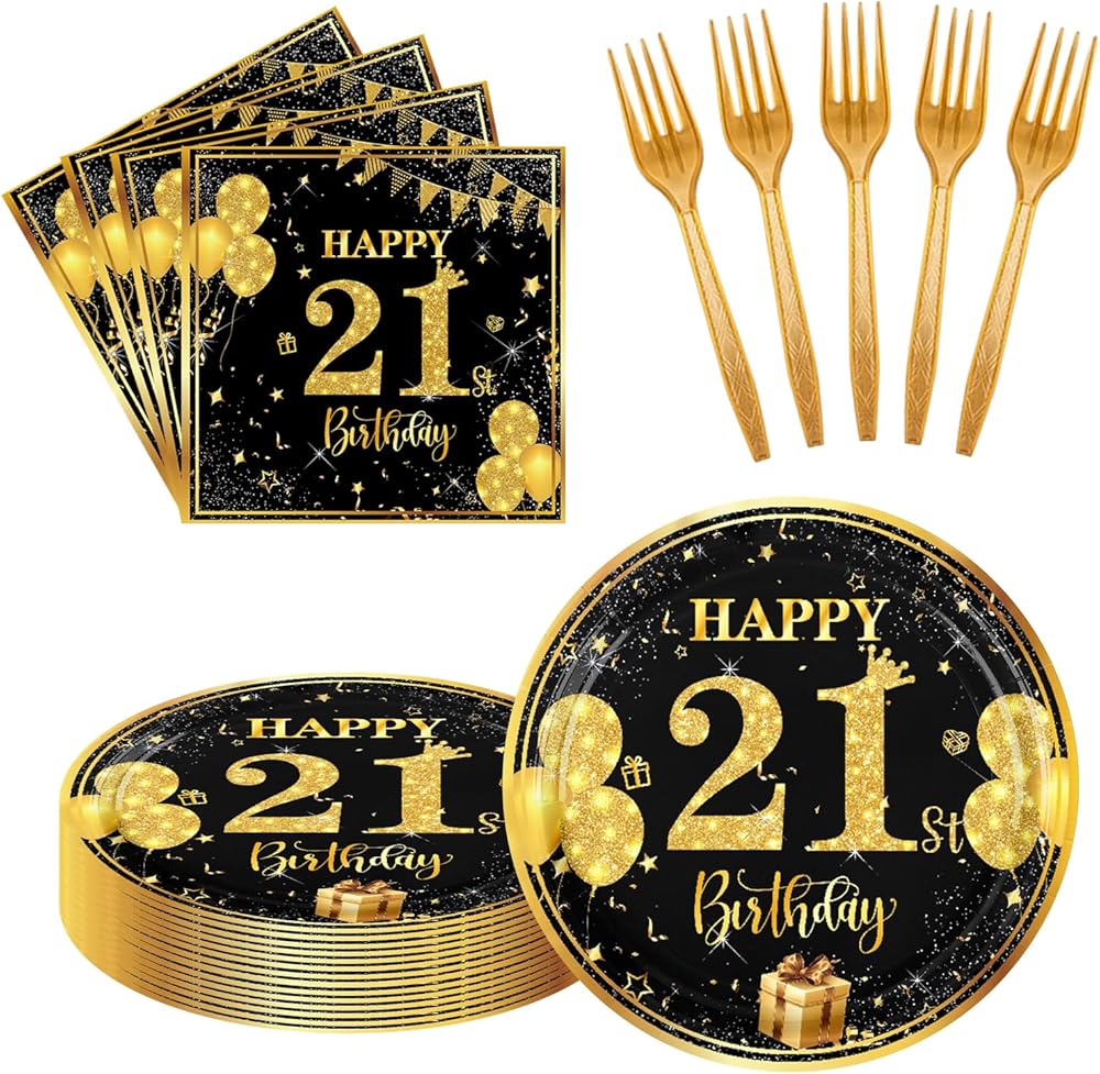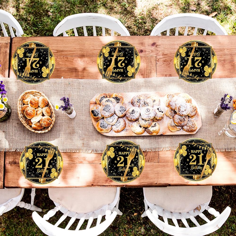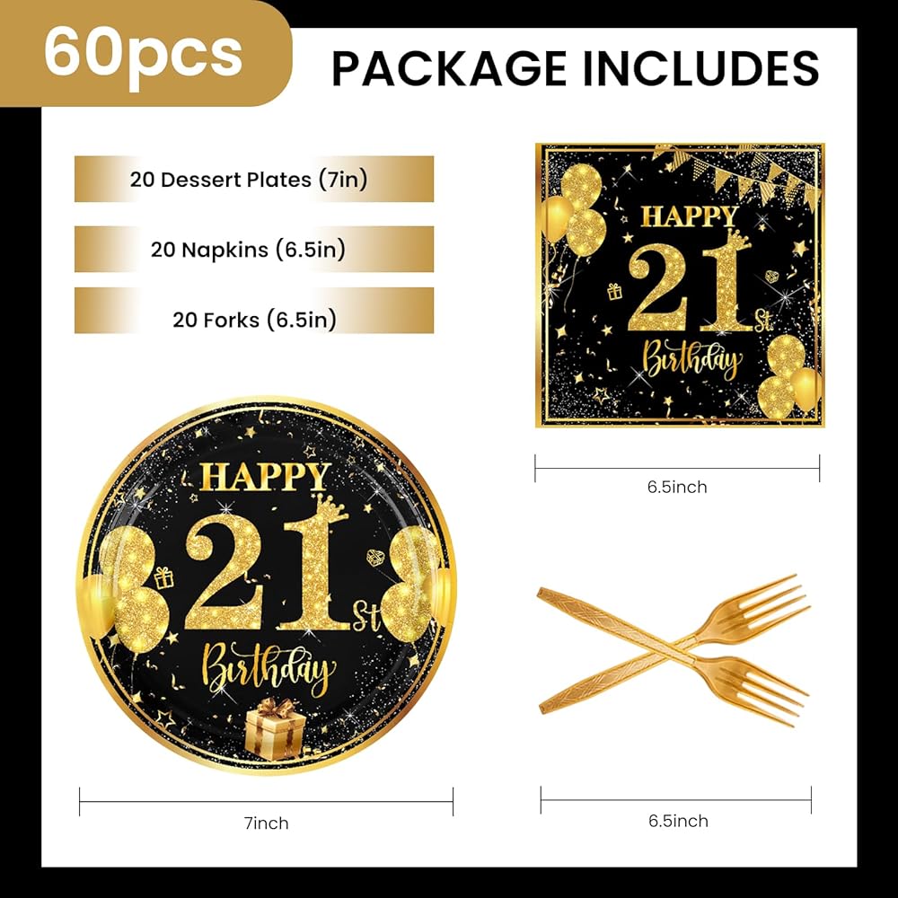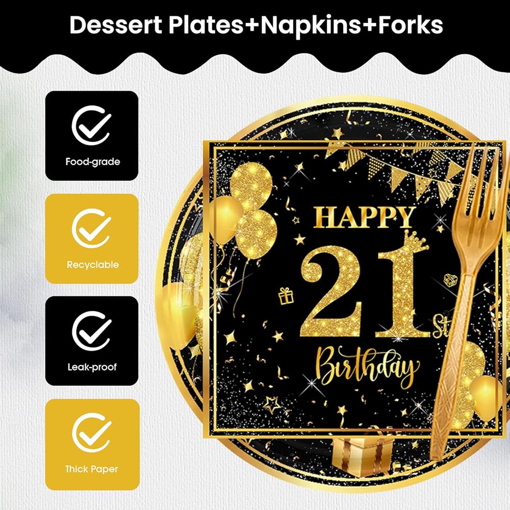 【مجموعة عيد ميلاد 70 كاملة】 كل شيء للاحتفالات الملحمية! لوحات أوراق عيد ميلاد سوداء وذهبية بحجم 7 بوصات + 20x تتطابق مع المناديل + 20x شوكات - لوحات عيد ميلاد 70 النهائي والمناديل المحددة للحفلات البالغة.