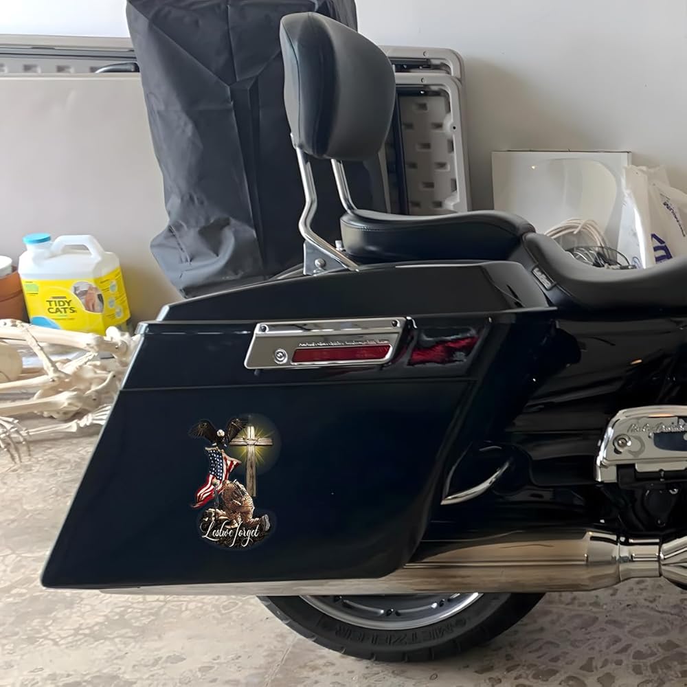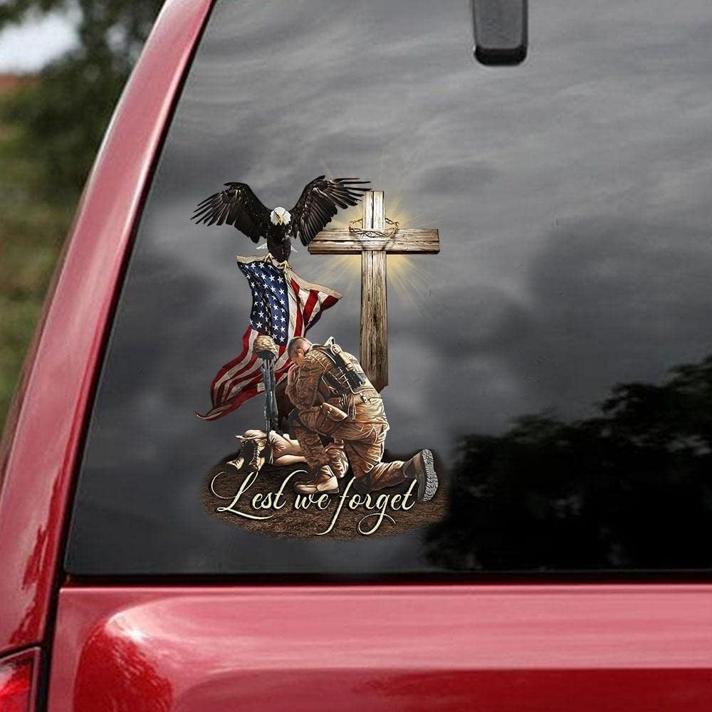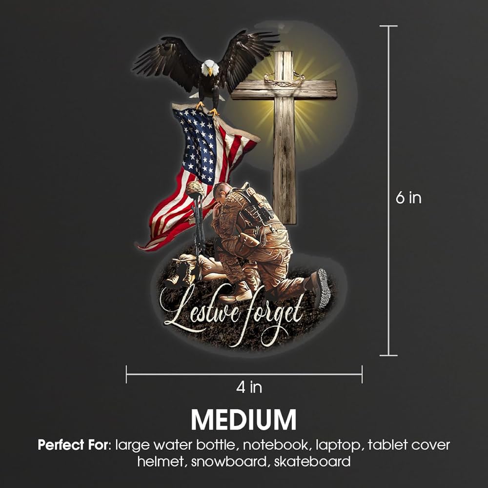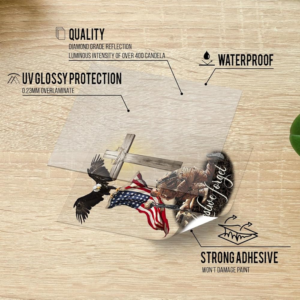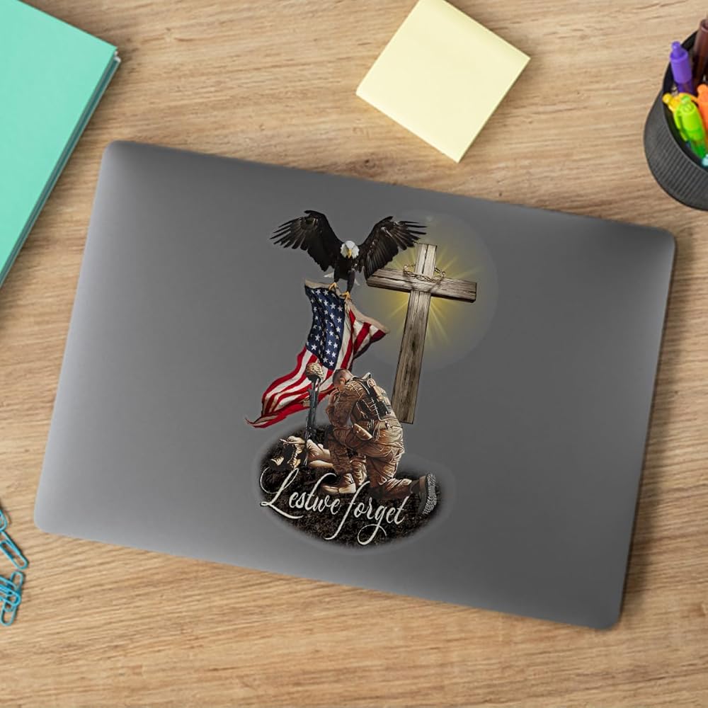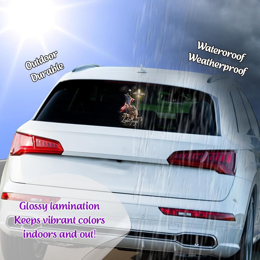 Veteran American Flag with Eagle and Jesus Cross Lost We Forget Car Window Decals, Meaningful Gift for American Veterans, Transparent Car Vinyl Decal Sticker for Car WindowsPremium Material: Crafted from 5-layer premium vinyl, ensuring colorfastness, water resistance, and UV protection.
