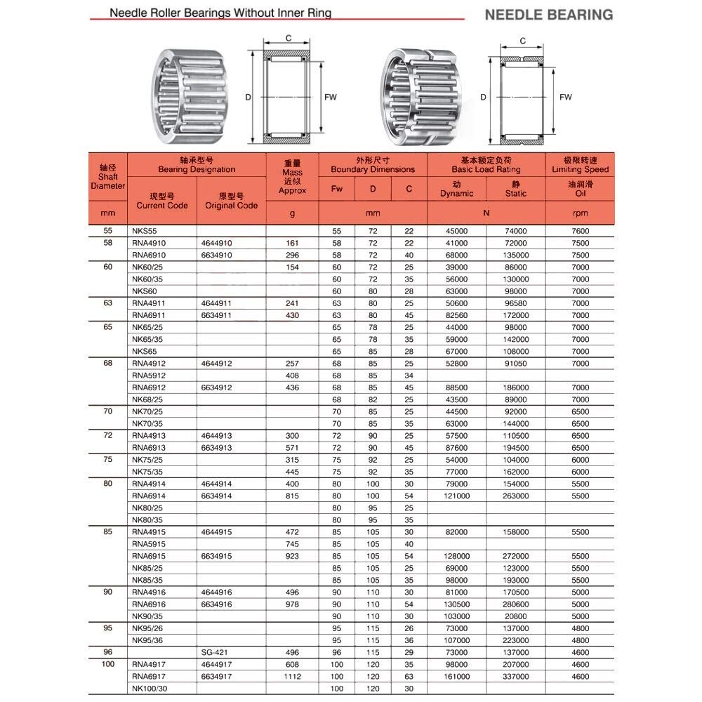 The needle roller bearing without inner ring is suitable for the parts of which the radial size is limited Because of no inner ring the surface of shaft journal fitted with it is acted directly as rolling surface It is requested that the surface hardness be no less than HRC60 surface roughness no more than 0.63μm. This kind of bearing does not limit th