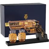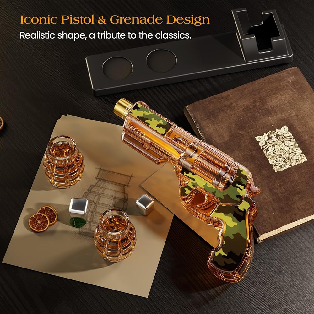 • تصميم مسدس وقنابل يدوي المصنوع يدويًا: يتميز بتصميم كلاسيكي على شكل مسدس مع علم أمريكي أو طباعة مموهة ، مقترنة بنظرين على شكل قنبلة يدوية. قطعة عرض قابلة للتحصيل تعزز كل لحظة شرب