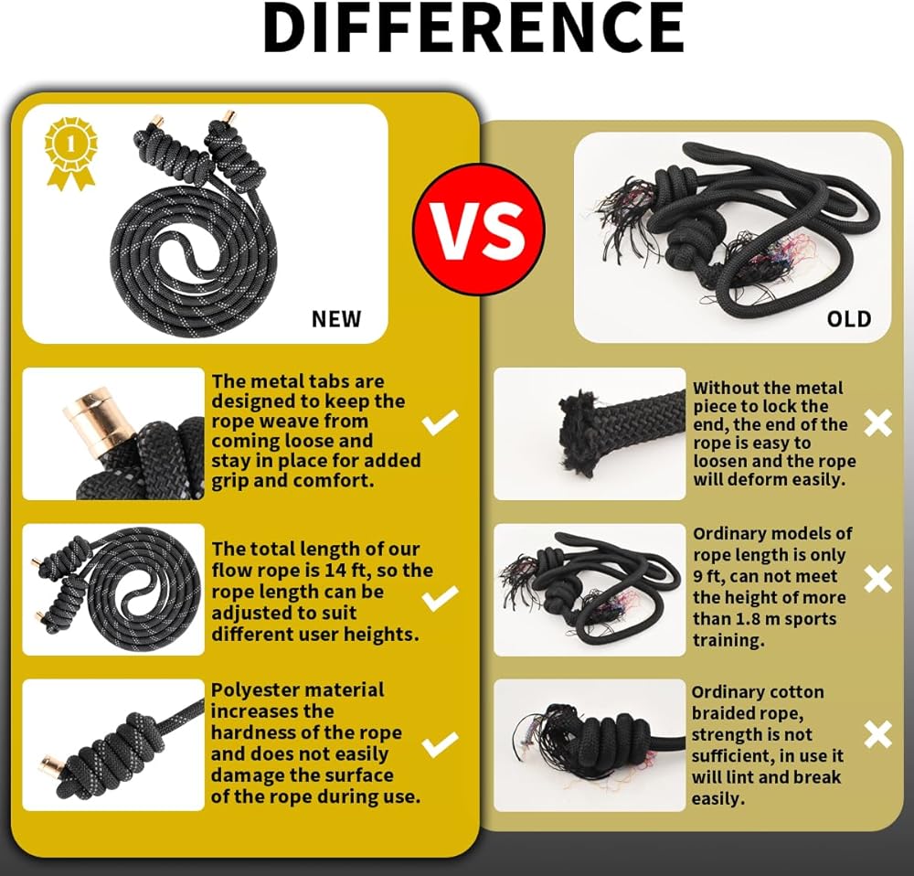 [هدف التدريب] يوفر حبل التدفق التمرين الهوائي المباشر والصحي ، المساعدة في تعزيز عضلات اليد ، وتعزيز قدرة الرئة ، وتعزيز الدورة الدموية ، والحفاظ على اليقظة والحيوية. بالإضافة إلى ذلك ، فإنه يتيح حرق السعرات الحرارية المتسقة أثناء التمرين ، مع تعزيز تنسيق الجسم عبر مجموعات العضلات المختلفة. لتكثيف التدريب ، يمكنك دمج وزن إضافي عن طريق ربط كائن مناسب بنقطة الوسط للحبل ، وتحقيق رغبتك