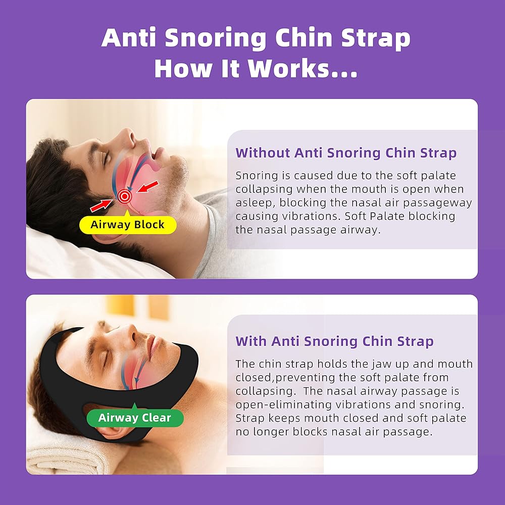 Snoring occurs when the muscles of the airway relax too much during sleep and vibrate when the air pass through the narrow passage way in which air travels to our lungs. This narrowing of our airway causes a vibration in the throat when you breathe, which causes the sound of snoring. The Psinzmk Anti Snoring chin strap is made to keep your mouth closed while sleeping. You will breathe through the nose but not mouth and it will prevent snoring instantly.