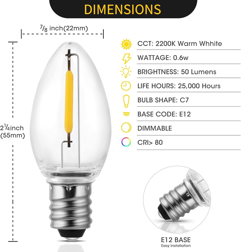 المواد ذات الجودة ذات الجودة لعمر طويل الأمد: مصنوع من الحبل القوي الخالي من التشابك ومصباح C7 الموفرة للطاقة التي تصل إلى 25000 ساعة ، فإن سلك التمديد مع المصابيح سهل الاستخدام وآمن للمس بسبب الجهد المنخفض.