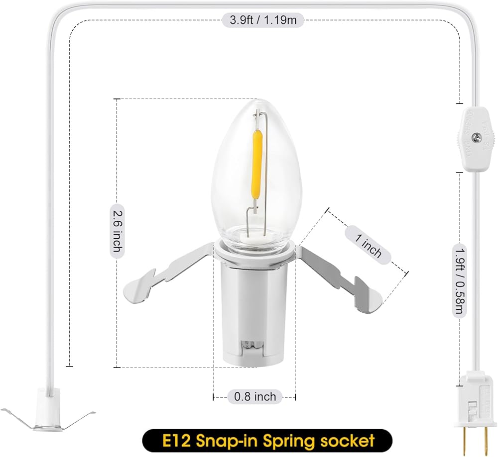 سلك التبعية مع مصابيح LED C7 ومفتاح التشغيل/إيقاف تشغيله: يبلغ طول سلك التبعي 6 أقدام لسهولة الاتصال بمنفذ الجدار. قابس معتمد للاستخدام الآمن. يتميز بمفتاح دوار على 360 درجة على تشغيل الضوء وإيقاف تشغيله بسرعة مع الضغط البسيط لزر واحد لتحكم سهولة في الإضاءة.