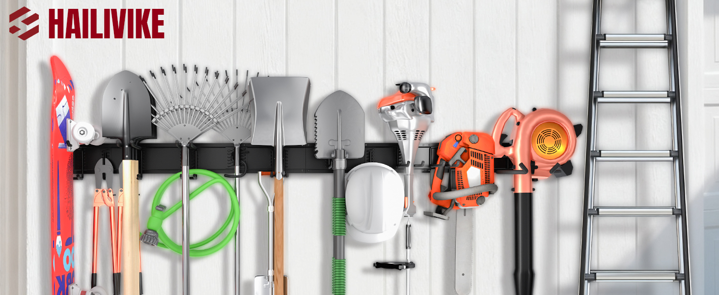 16.5 inch Length Multi-function Garage Wall Organizer: The wall rack with 16" hole spacing length meets garage stud standards! The organization for garden tools includes 1 wall rack, 4 adjustable garage hooks, and 4 storage straps