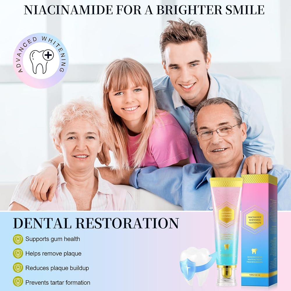 【معجون أسنان أبيض من النيكوتيناميد】 المخصب بالجزيئات الطبيعية وجوهر النيكوتيناميد ، فإن معجون الأسنان تبييض النياسيناميد يزيل سنوات من القهوة والشاي وبقع النبيذ لابتسامة أكثر وضوحًا.