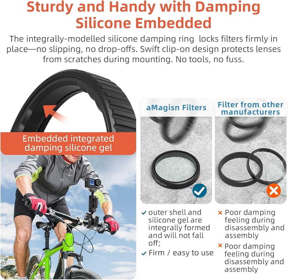 【Sturdy and Handywith Damping SiliconeEmbedded】 Theintegrally-modelled silicone damping ring locks filters firmlyin place-no slipping, no drop-offs. Swift clip-on design protects lenses from scratches during mounting.No tools, no fuss.