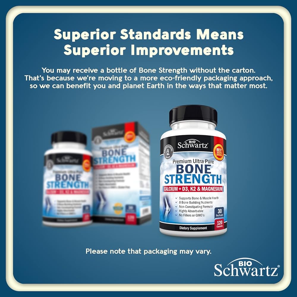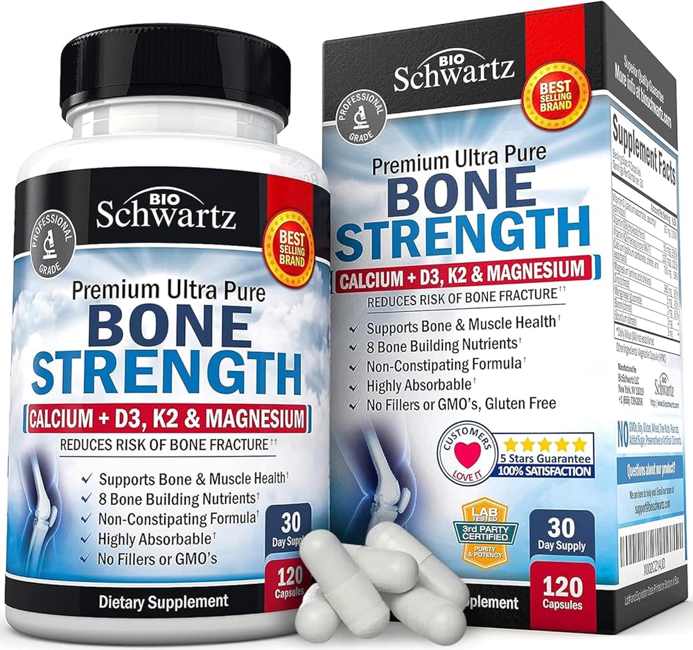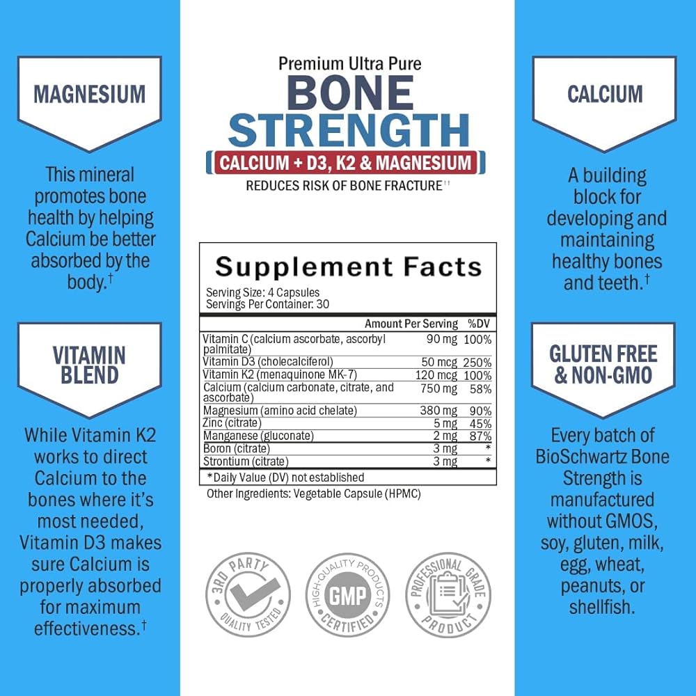 تركيبة شاملة لصحة العظام: تتميز قوة العظام فائقة النقاء من BioSchwartz بالعناصر الغذائية الأساسية لبناء العظام بما في ذلك فيتامين K2 والكالسيوم وفيتامين D3 لدعم العظام.