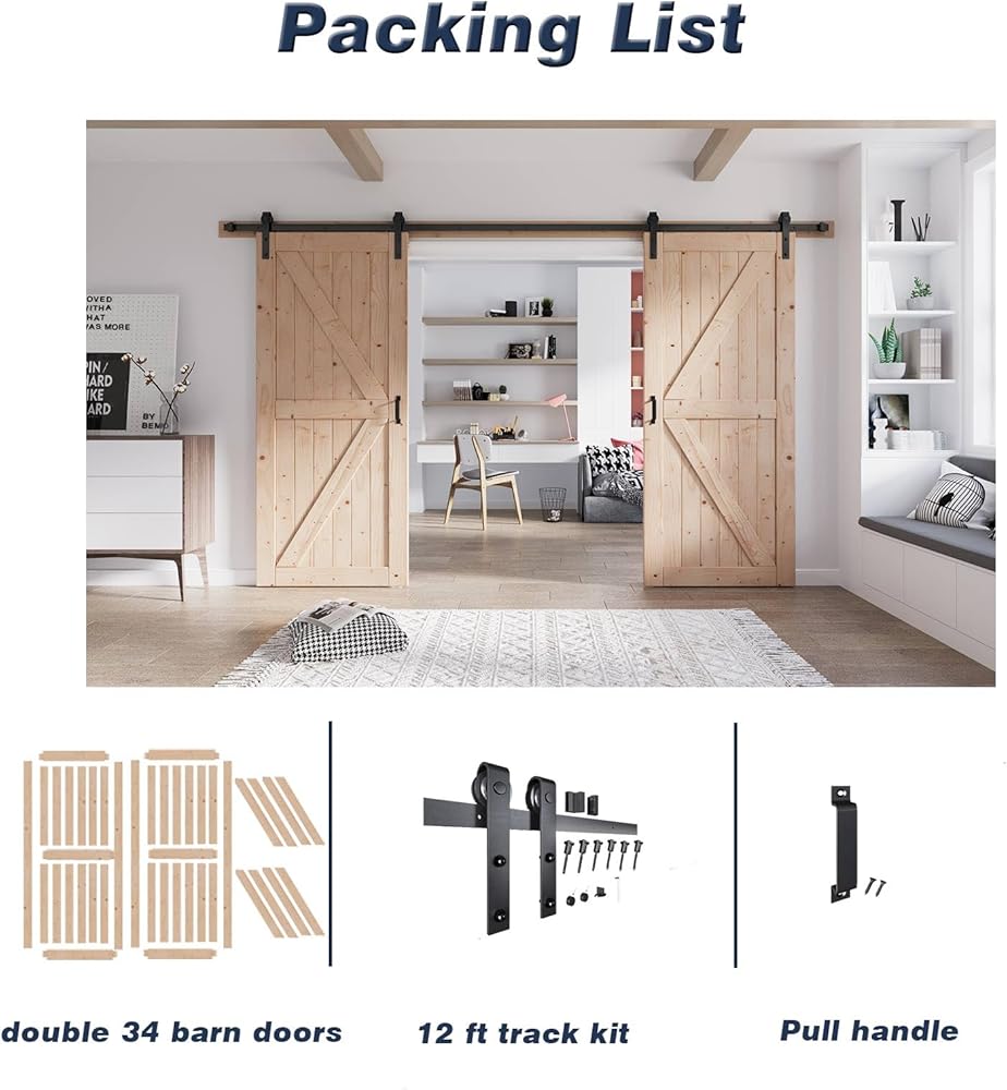 البعد: العرض: 68 "، الارتفاع: 84" ، سمك: 1 3/8 "، جوهر صلب سميك: 1/2". يمكن قلب الباب في أي من الاتجاهين. كان الجزء السفلي من الباب أخدود قبل الصنع لدليل الأرضية. / الوزن: 53 رطل. (شملت الحزمة: جميع البراغي المدرجة جنبًا إلى جنب مع فتحات الخشب المسمار مسبقًا وتعليمات مفصلة تضمن سهولة التجميع. مجموعة مسار 12 قدمًا: مسار 2x 6ft ، شماعات 4x ، فاصل 5x ، دليل أرضي 2x ، مقبض سحب 2x.