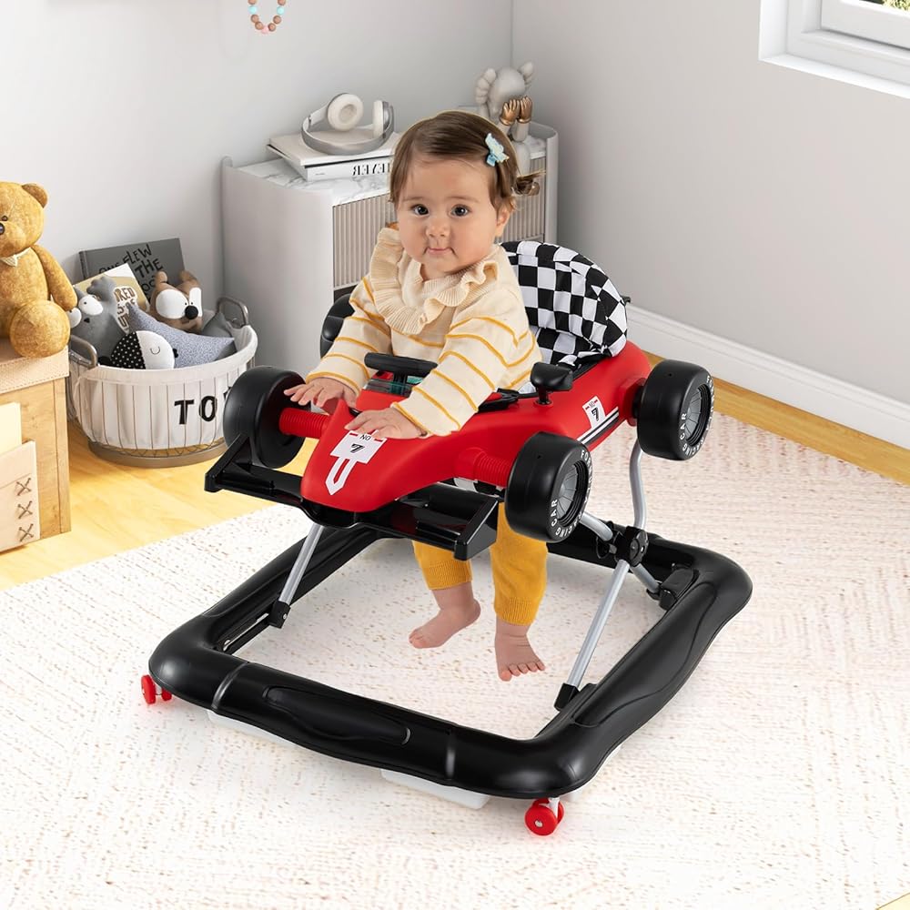 With a 3-position adjustable height(20”/21”/22”), the toddler walker ensures a comfortable fit. Its universal front and deceleration safety wheels ensure smooth and secure movement, while the pyramid structure and anti-skid blocks offer enhanced stability and safety. Additionally, the detachable music box with lights, sound, and interactive elements enhances imaginative play. When not in use, the foldable car walker can be stored away in a compact space.
