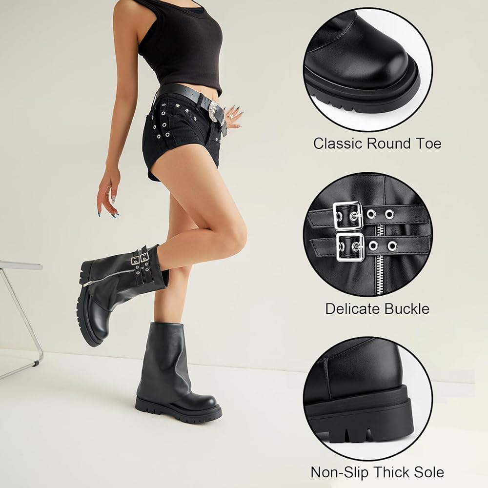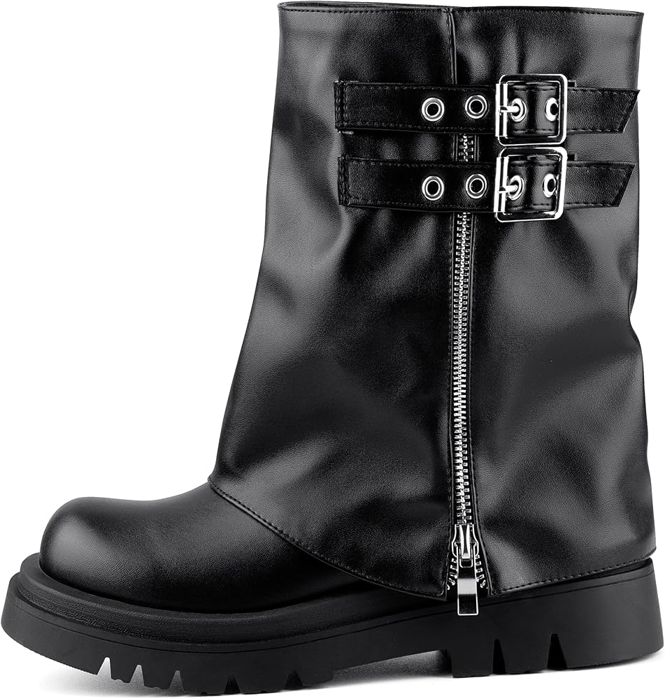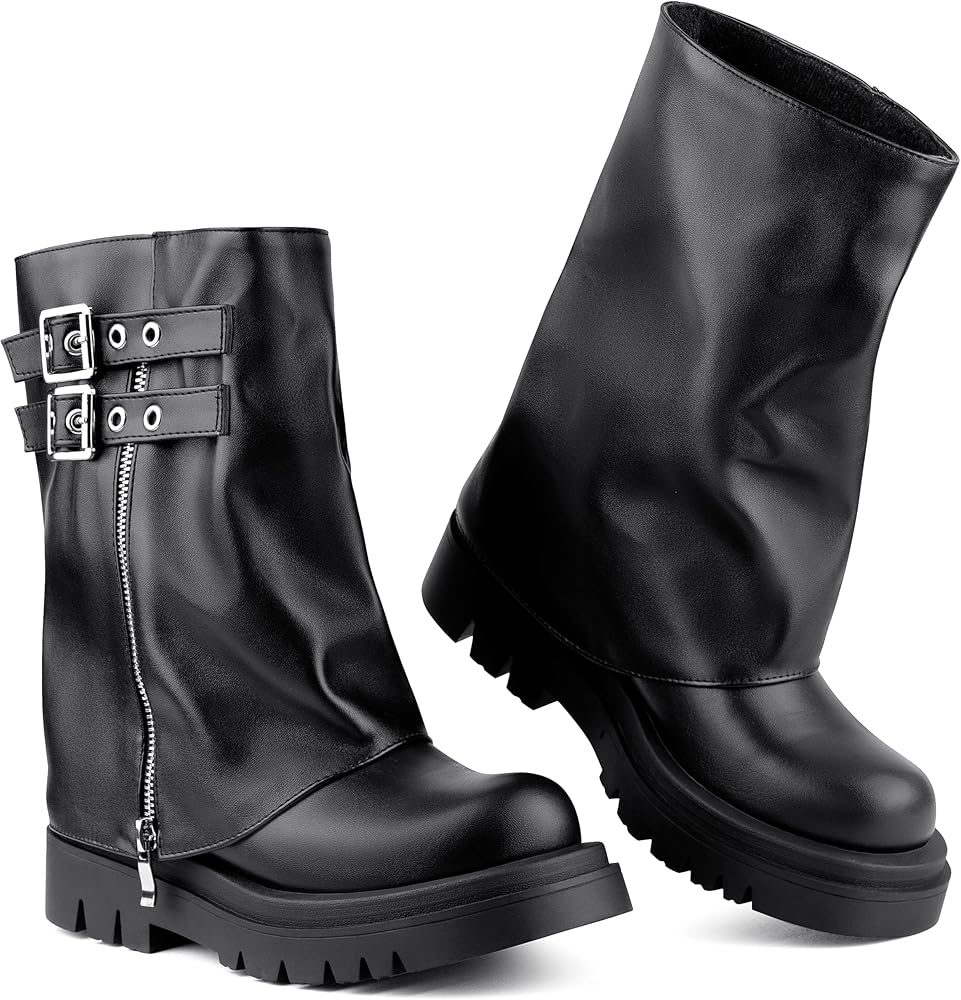 نمط البيان المستوحى من الشرير: تتميز هذه الطية فوق الأحذية بالجلد المصنوع المصنوع ، وأشرطة الإبزيم الجريئة ، والطيات غير المتناظرة التي تلتقط دراجة نارية متمردة وعلم جماليات الشرير-مثيرة لإحداث انطباع عنيف.