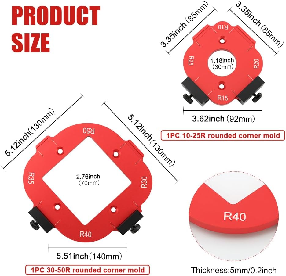 【8 Versatile Radius Sizes in One Set】Includes two templates with 8 radius options (R10/R15/R20/R25/R30/R35/R40/R50) to effortlessly create smooth, consistent rounded edges for furniture, cabinetry, crafts, and more.