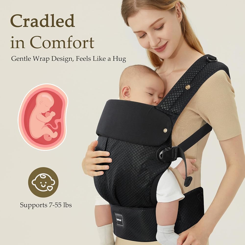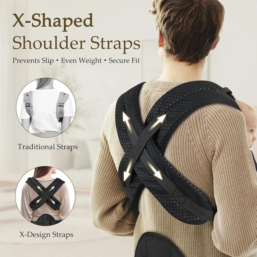 حاملة أطفال مع دعم لمنطقة أسفل الظهر، حاملة أطفال مريحة لحديثي الولادة وحتى الأطفال الصغار، حاملة أطفال ذات وجهين أماميين مع حلقة تعليق، حامل أطفال سهل التعديل للأم والأب، أسود