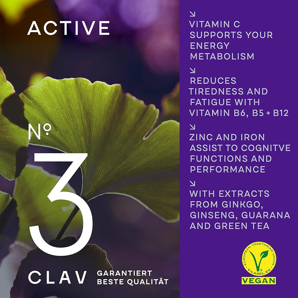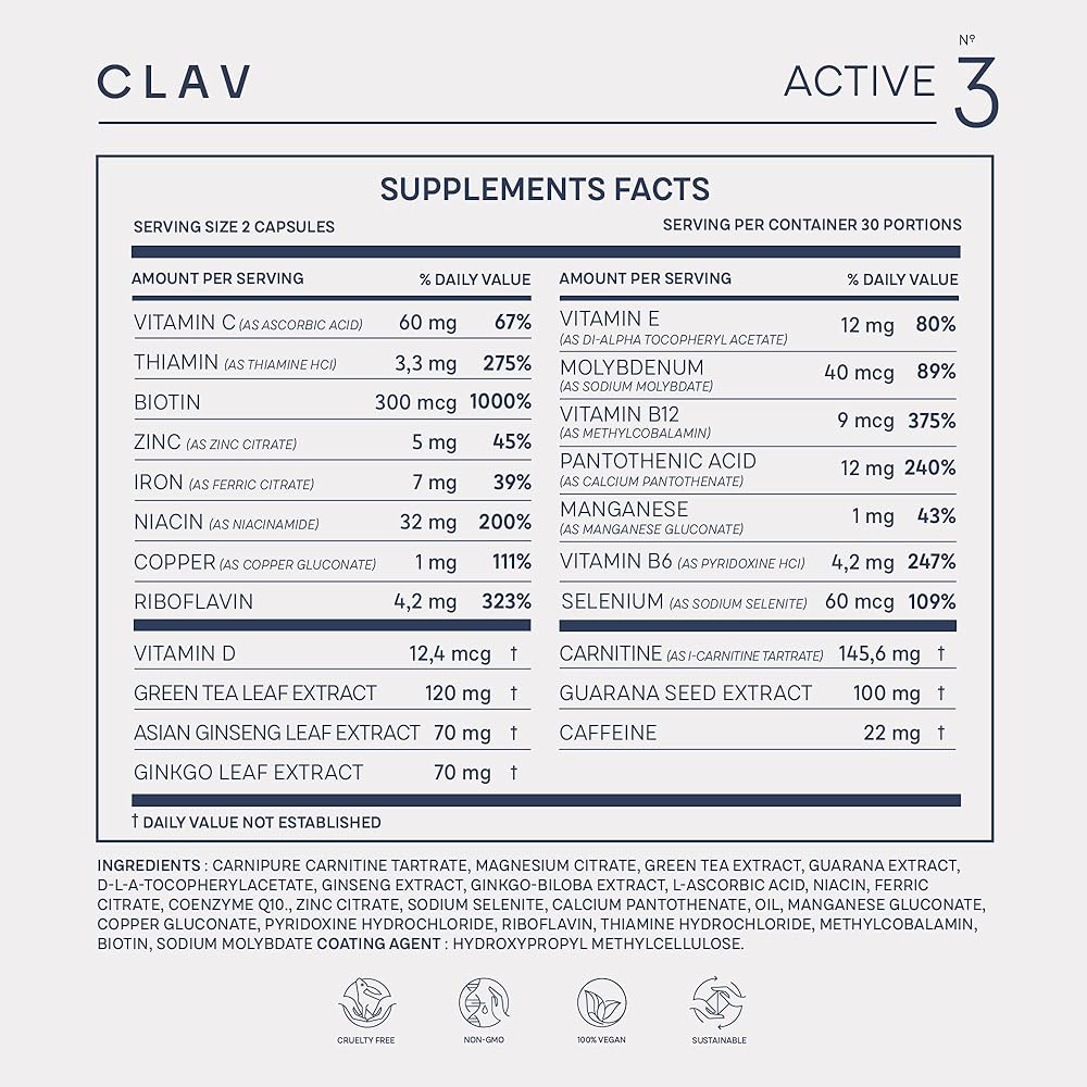 CLAV® N°3 Vitality Support - فيتامينات نباتية متعددة - مكملات الطاقة والتركيز - مركب فيتامين ب - الجوارانا، الجينسنغ، مستخلص الجنكة - 60 كبسولة - شهر واحد