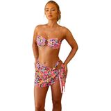 DESIGN FEATURES: Pink Queens Choice Trendy bandeau-style bikini top with decorative O-ring detail at center, paired with matching string bikini bottom in vibrant floral print