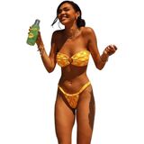 STYLE DETAILS: Strapless bandeau top offers modern silhouette, while the high-cut bikini bottom features adjustable side ties