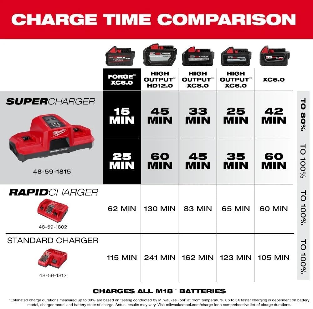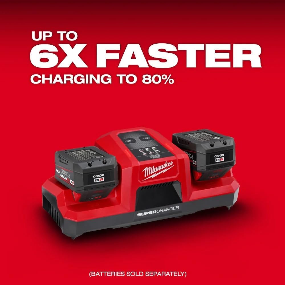 Up to 6X faster charging to 80% 15 minute supercharge on the M18 REDLITHIUM FORGE XC6.0 to 80% Simultaneously charges two (2) M18 batteries CHARGE ADAPT: Adaptive Charge Distribution delivers adaptive simultaneous charging for multiple batteries to maximize productivity