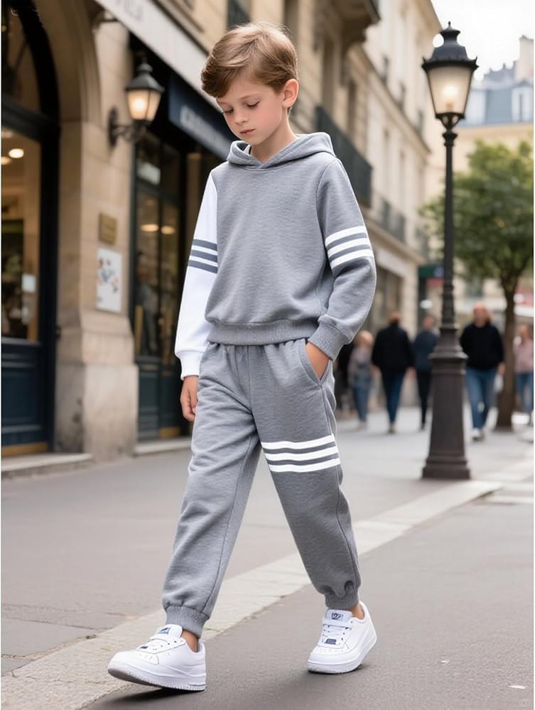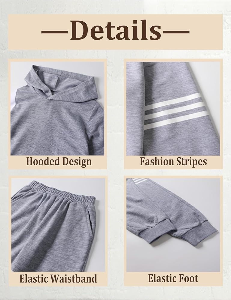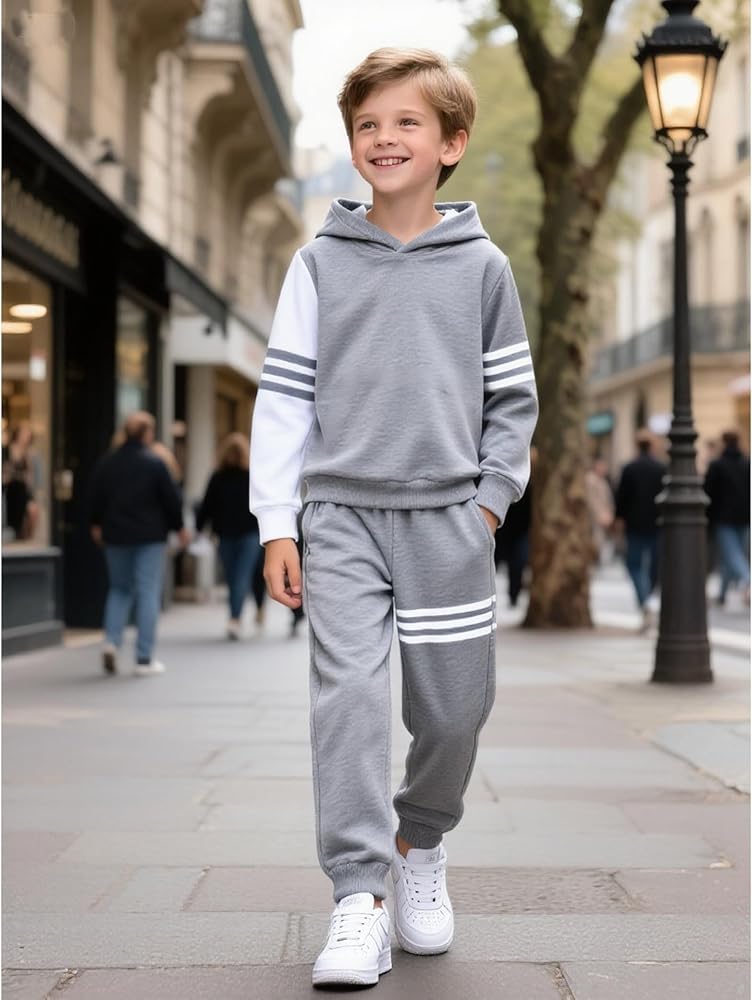 تصميم الأزياء: تتضمن المجموعة هودييًا ورواسب رياضية طويلة الأكمام ، ويتميز بخطوط متباينة جريئة على الأكمام لتأثير بصري مذهل. تم تصميم السراويل مع حزام مرن وأصفاد ، مما يجعلها سهلة وضعها وإقلاعها مع ضمان ملاءمة آمنة ومريحة. لا يسمح هذا الزي بحركة غير مقيدة فحسب ، بل يساعد أيضًا أن يبرز ابني ، ويعتزم إحساسه بالأناقة.