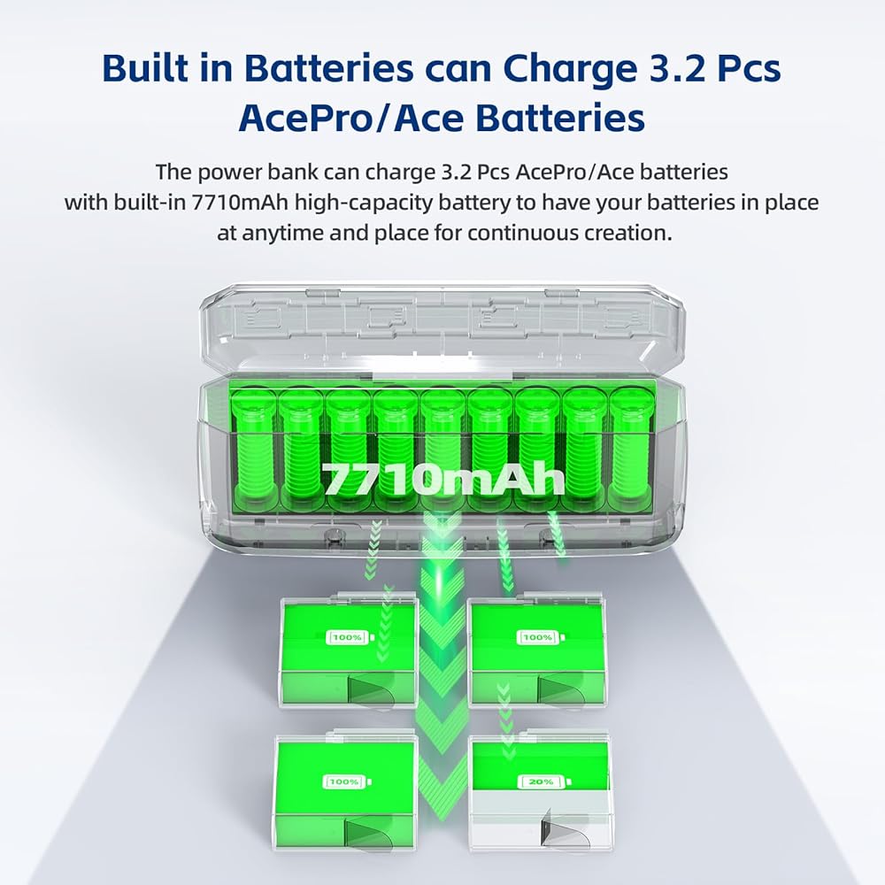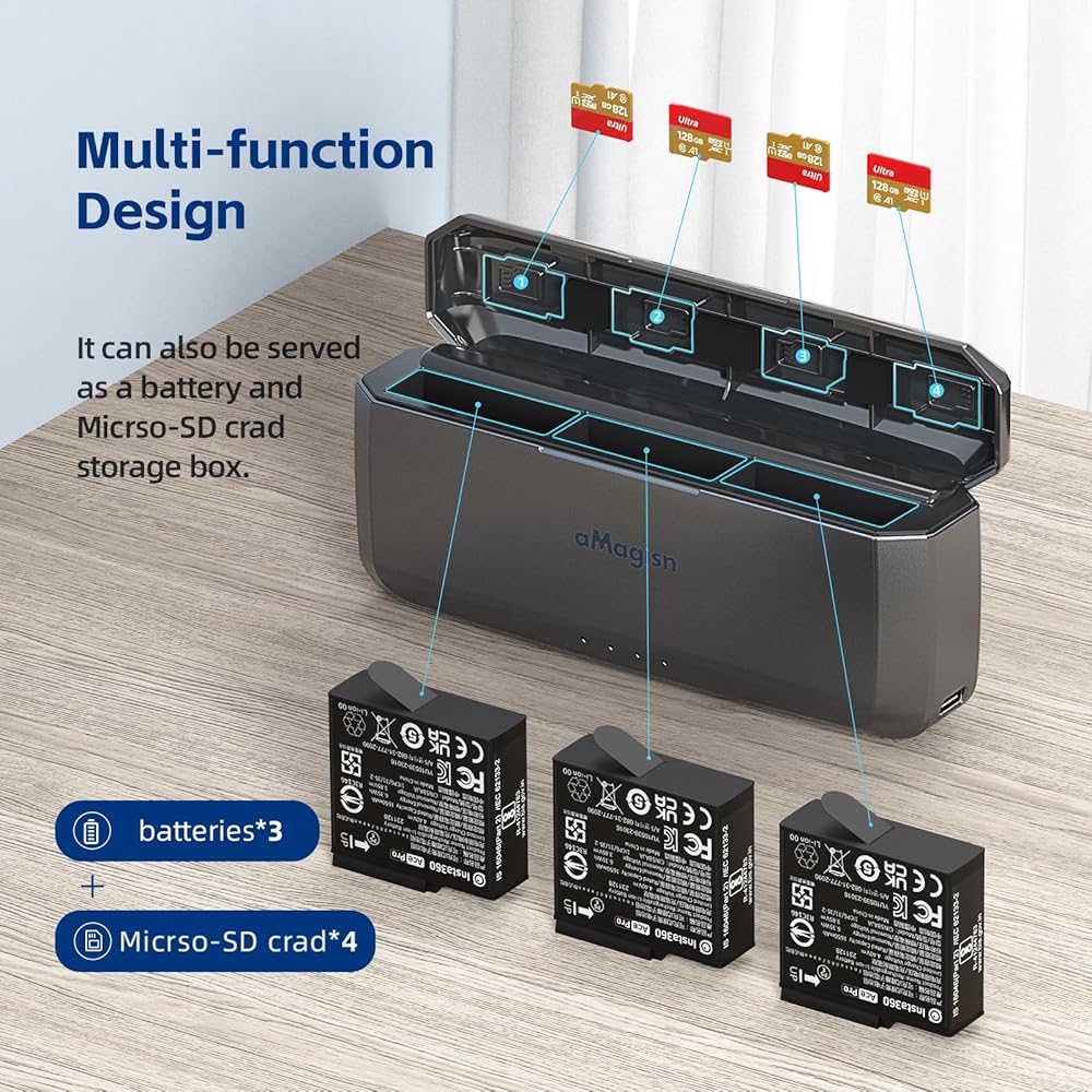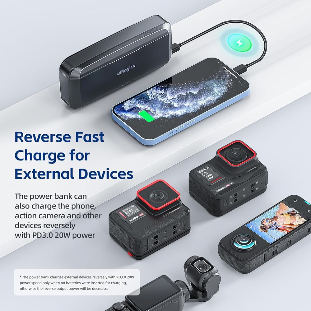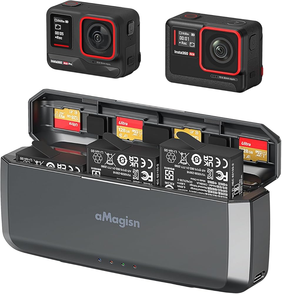 3-in-1 Charging & Storage Hub: Charge 3 Insta 360 Ace Pro/Ace batteries at 20W fast speed with the built-in 7710mAh multifunctional power—never miss a shot. Triple your versatility: Also charge other devices such as mobile phones and action cameras, serving as a practical backup power source to help you deal with emergencies. Besides, this Insta 360 Ace Pro/Ace battery charger can store 4 SD cards securely in dedicated slots, so you no longer have to worry about losing your SD cards.