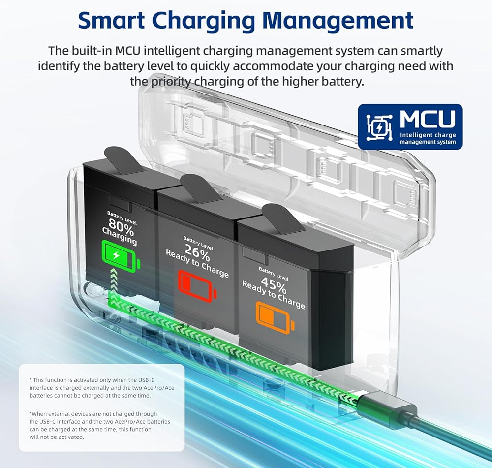 True 35-Minute Express Charge: Go from 0% to 80% in 41 mins—a full charge takes just 64 minutes. (Note: The Insta 360 Ace Pro/Ace fast charger hub can' t charge 2pcs or 3pcs Ace Pro/Ace batteries at the same time if the USB-C cable of it is connected with external devices for charging.)