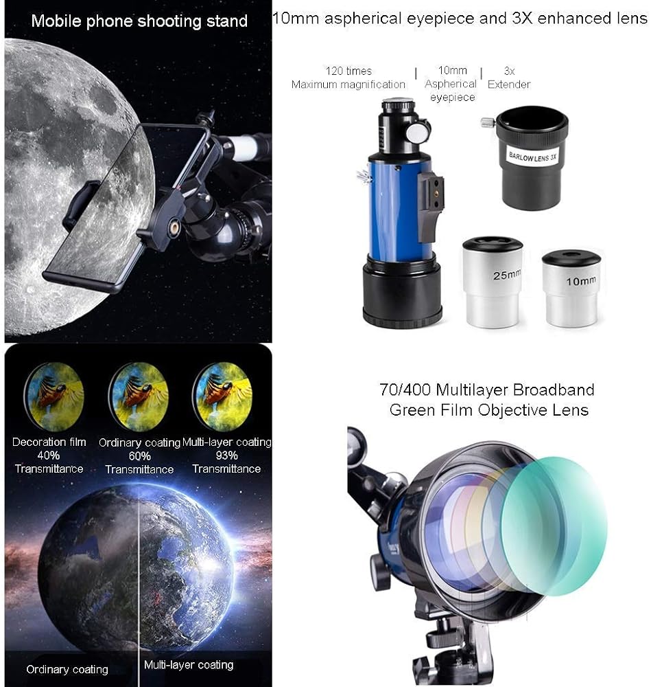 1. The refractor has a strong focal length, a large field of view, and a strong resolution.Multilayer optical coating,Refractive optical system,high light transmittance, and enhanced image brightness and clarity.Aluminum tripod