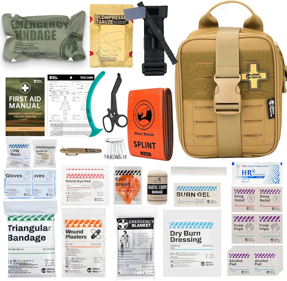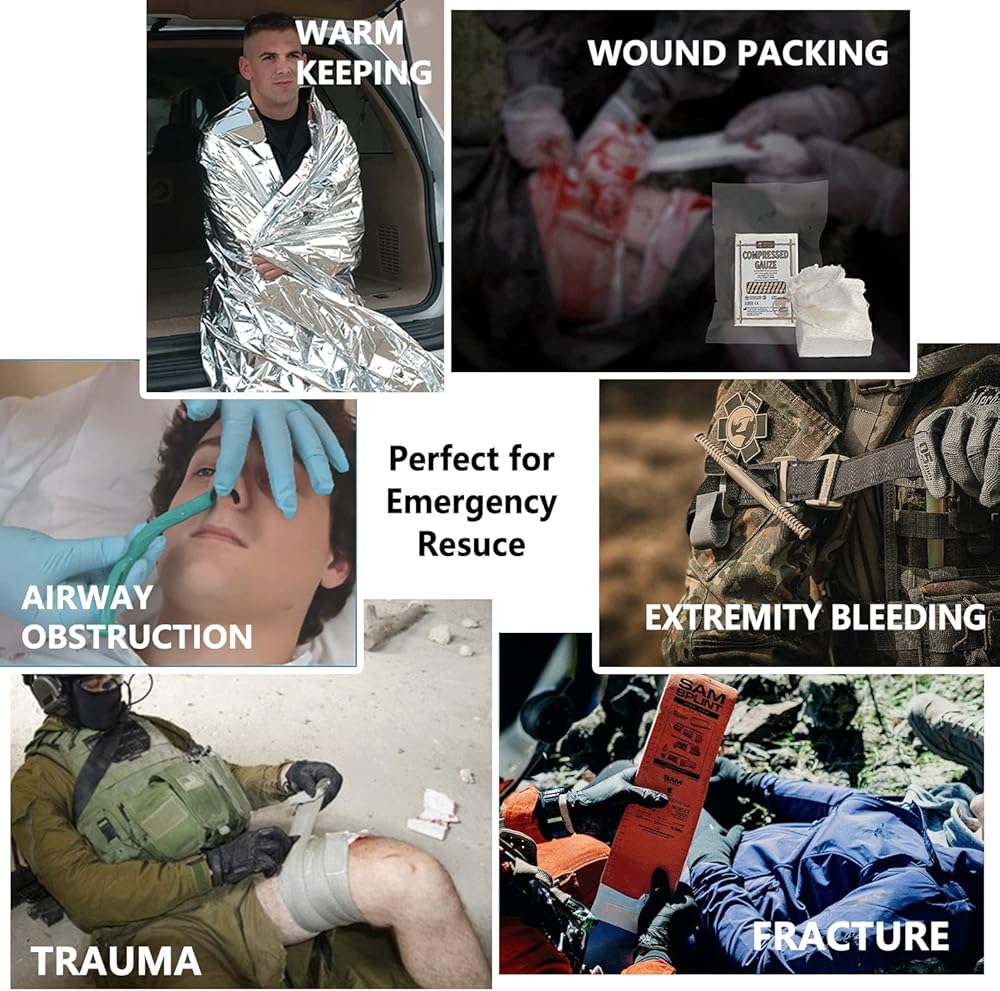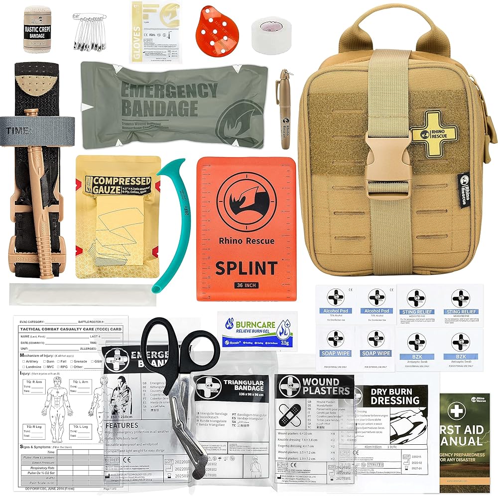 [النزيف الضخم والعناية بالدورة الدموية] - لوازم الإسعافات الأولية المدمجة للتحكم في النزيف بما في ذلك عاصبة القتال العسكرية، وضمادة ضغط المعركة الإسرائيلية، وضمادة ذاتية الالتصاق، ووسادة تنظيف ووسادة غير ملتصقة.