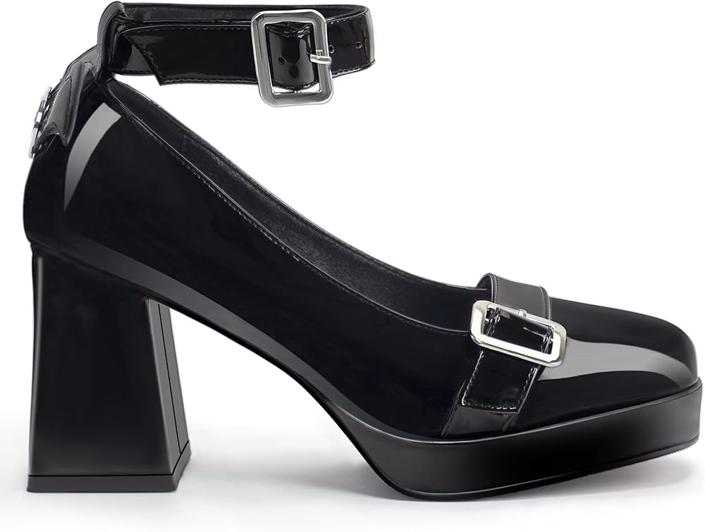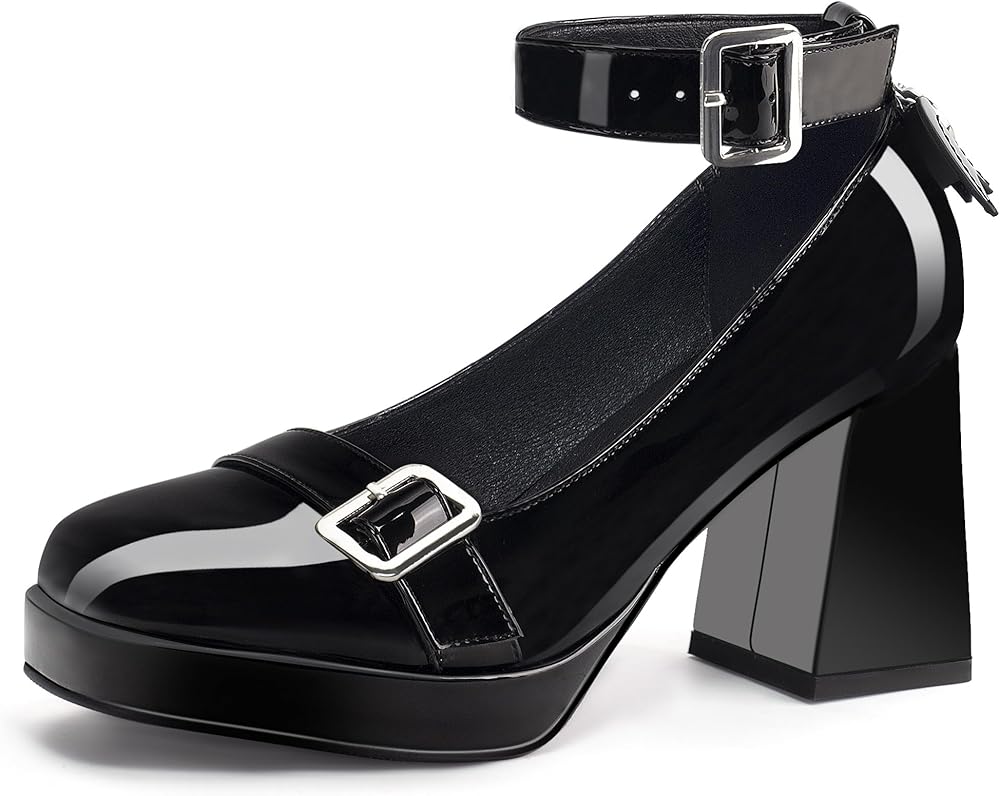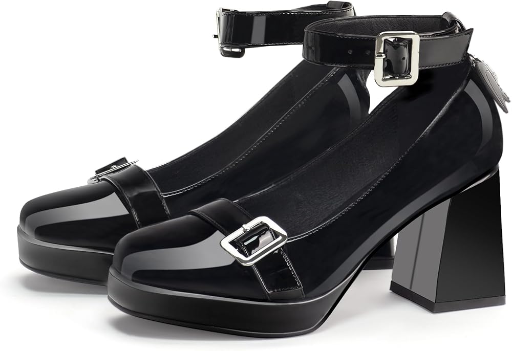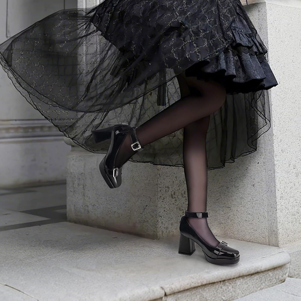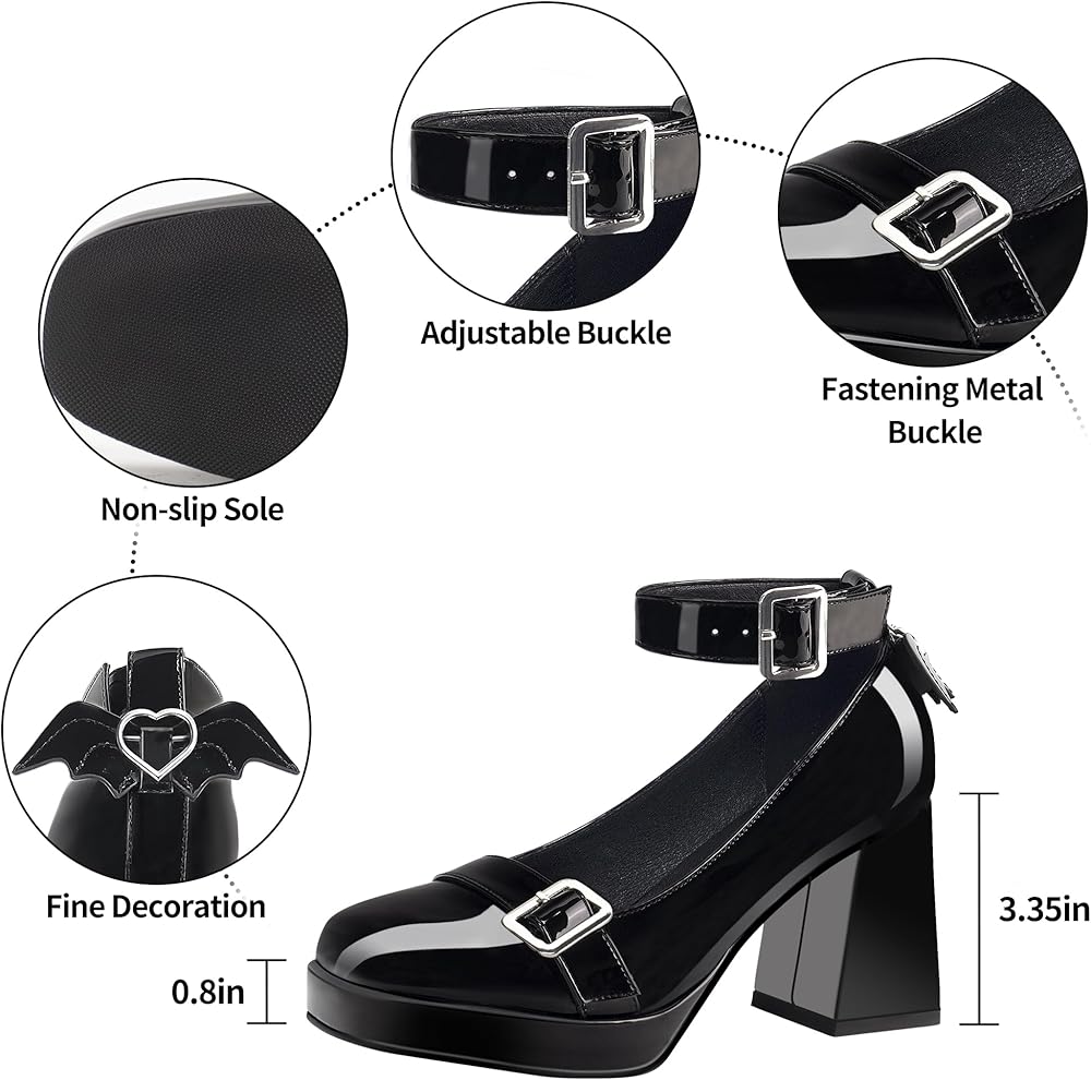 These square toe Mary Jane heels feature a bold gothic design, perfect for pairing with dresses, jeans, or pants. Ideal for work, parties, and streetwear, the adjustable buckle ensures a secure fit. Durable and stylish, they make a great gift, combining unique charm with everyday practicality.
