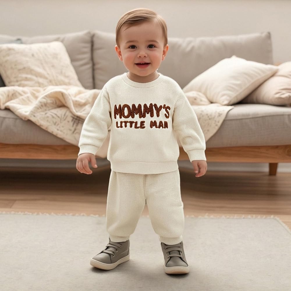 Baby Boy Fall Outfit Mama Boy Embroidery Striped Waffle Baby Sweatshirt Elastic Pants Toddler Boy Festival Clothes