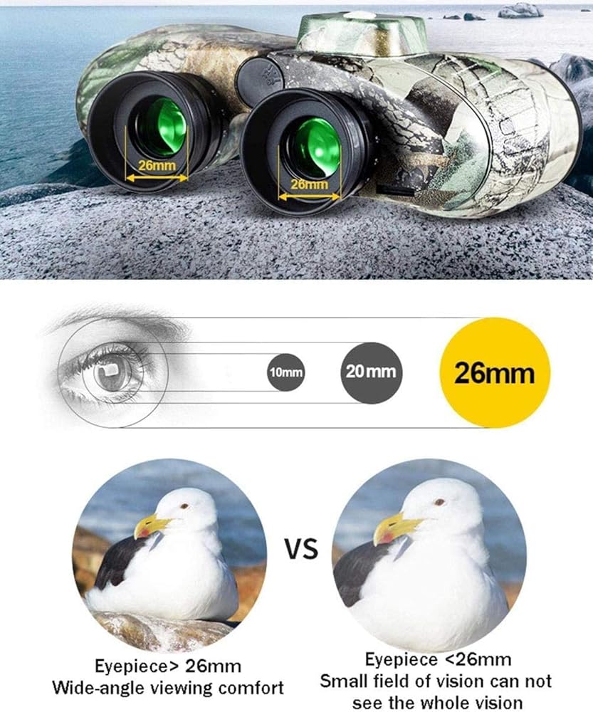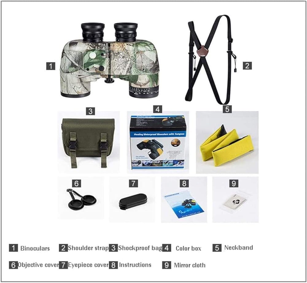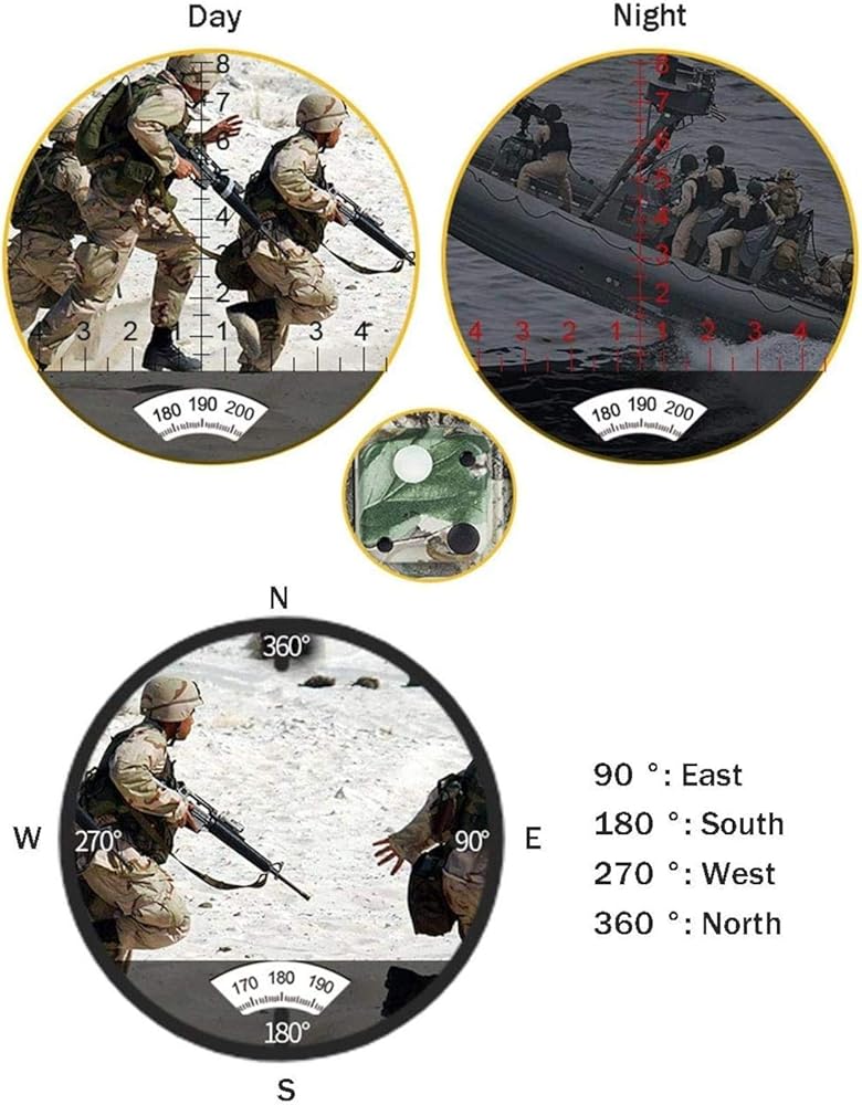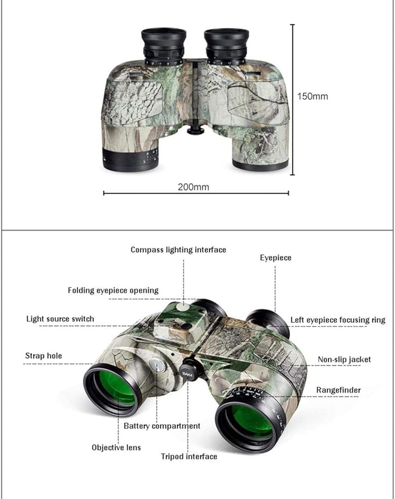 Binoculars with Compass: With the built-in compass and scale, you can easily calculate the target distance or target height, in addition, If you do not have enough light to read the compass readings, you can also use the built-in lighting in the Binoculars (Free LR936 / AG battery).