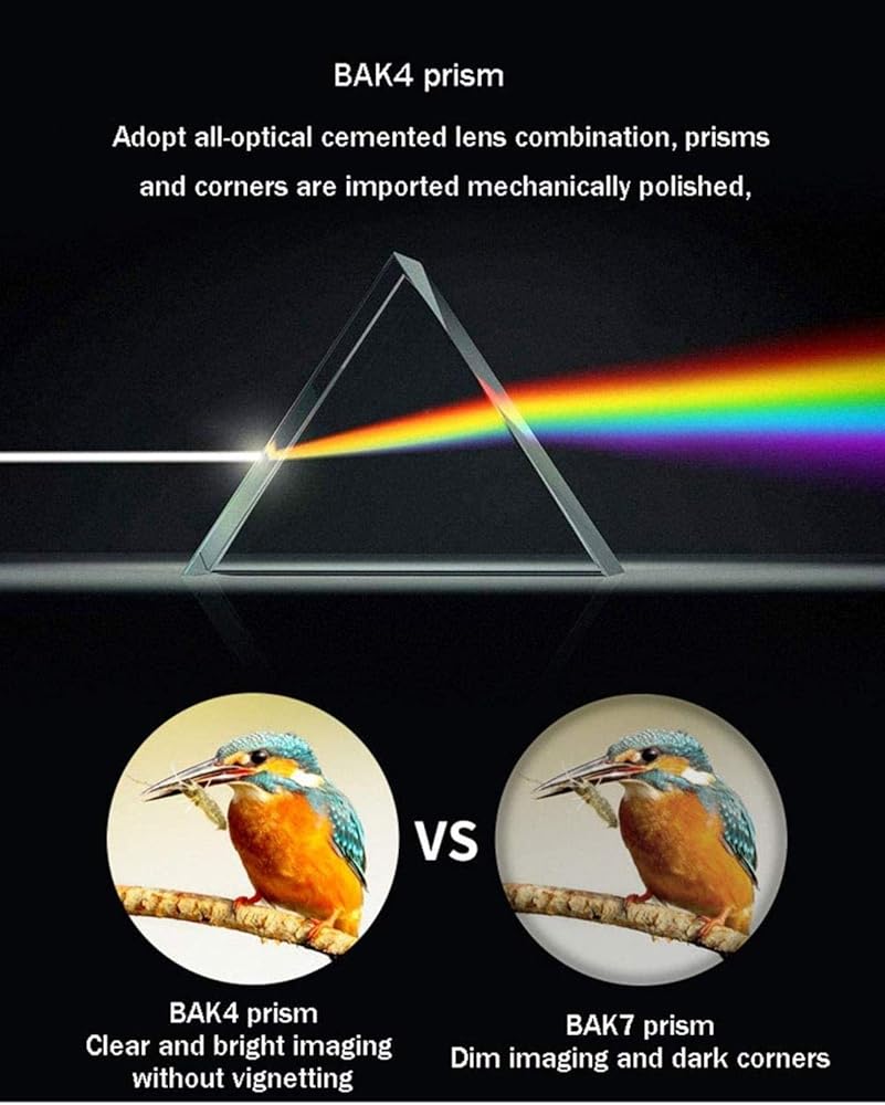 BAK4 FMC porro Binoculars : The refractive index of Bak4 is much higher than that of BK7, effectively eliminating internal light loss. FMC has the best light transmission, bright field of vision, and true color reproduction. The porro prism system makes the image clear, bright, and more depth-of-field.