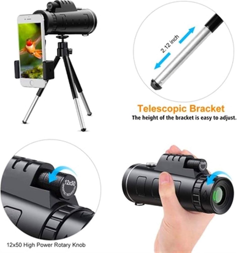 12x50 تلسكوب أحادي الطاقة عالي الطاقة مع حامل هاتف ترايبود - مثالي للسفر والعرض والصيد