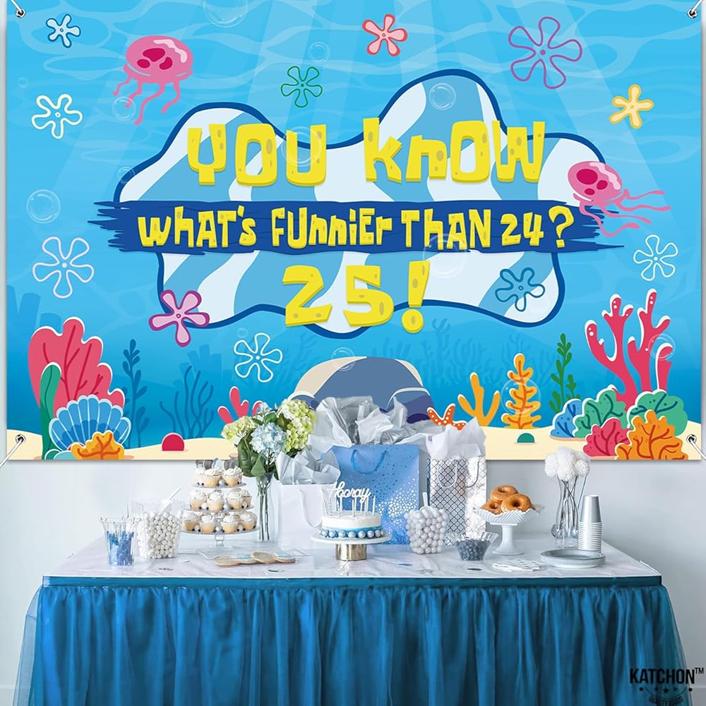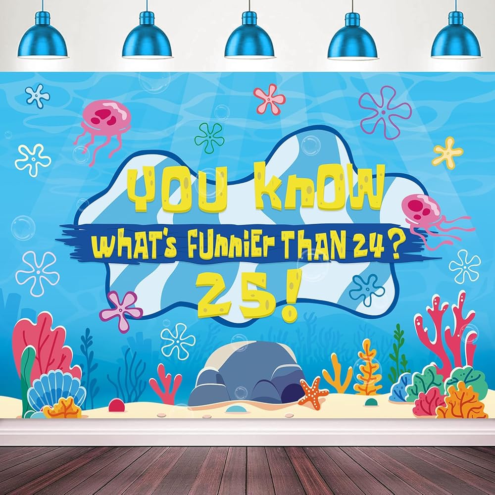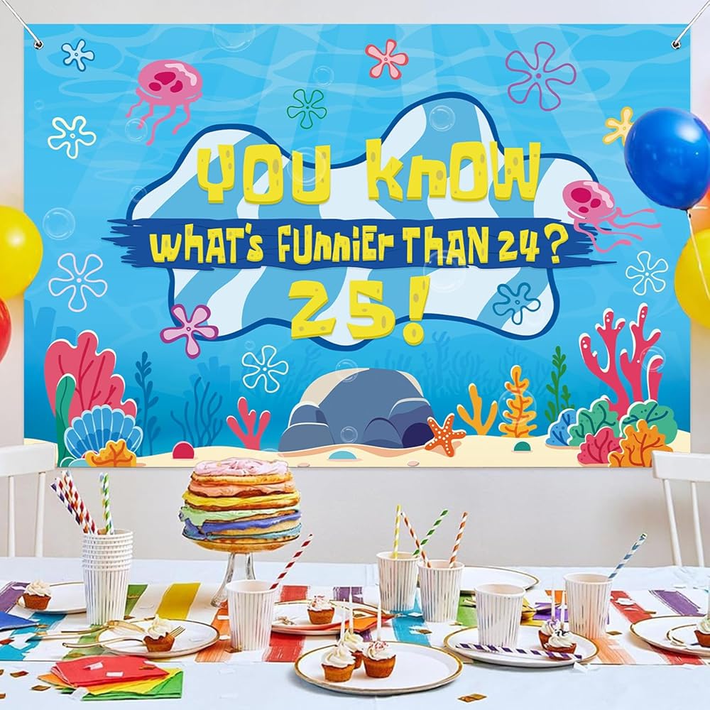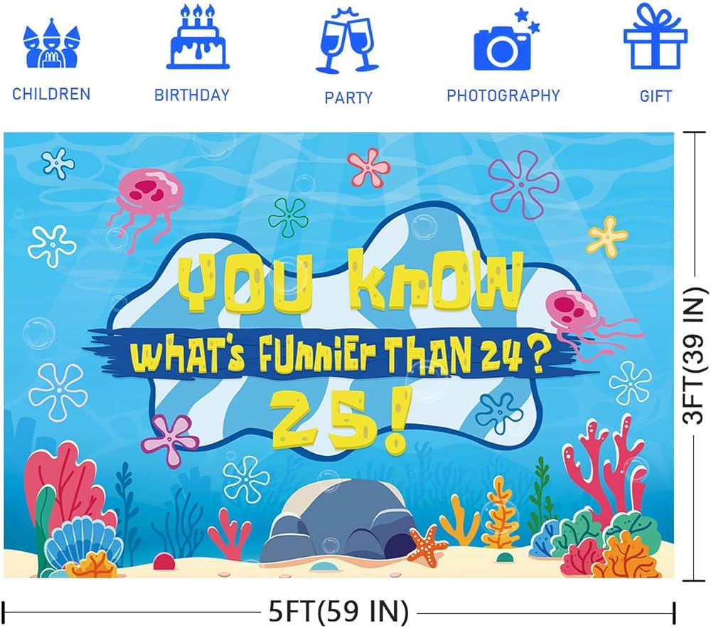 Eye Catching Design: Our birthday decorations backdrop banner adopts the iconic blue tone of the beach and combines classic patterns such as jellyfish, starfish, seaweed and coral with the humorous celebration text "You know what's funnier than 24? 25!". The prints are bright and vivid, presenting the underwater world in a lifelike manner