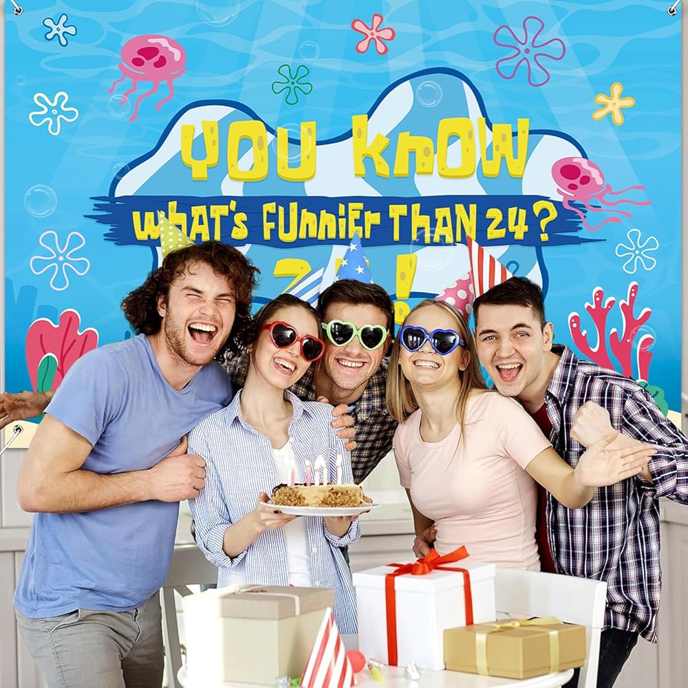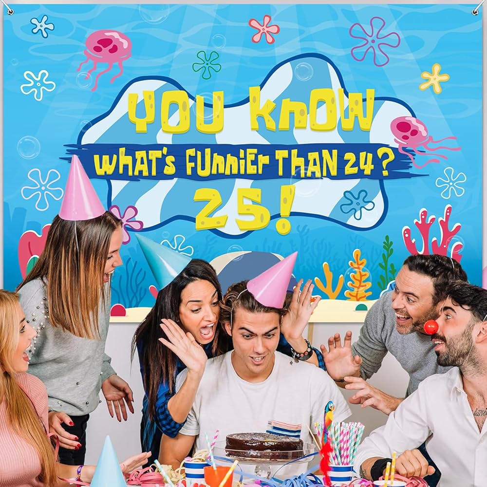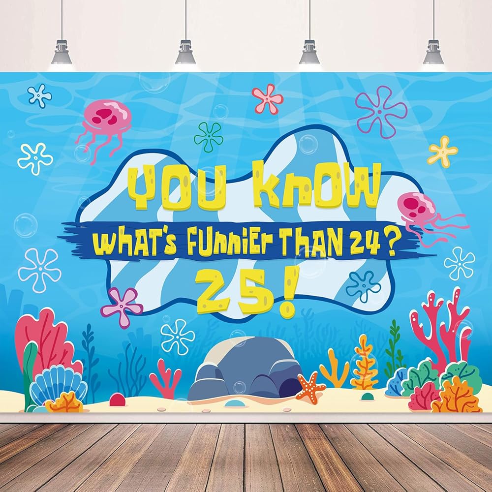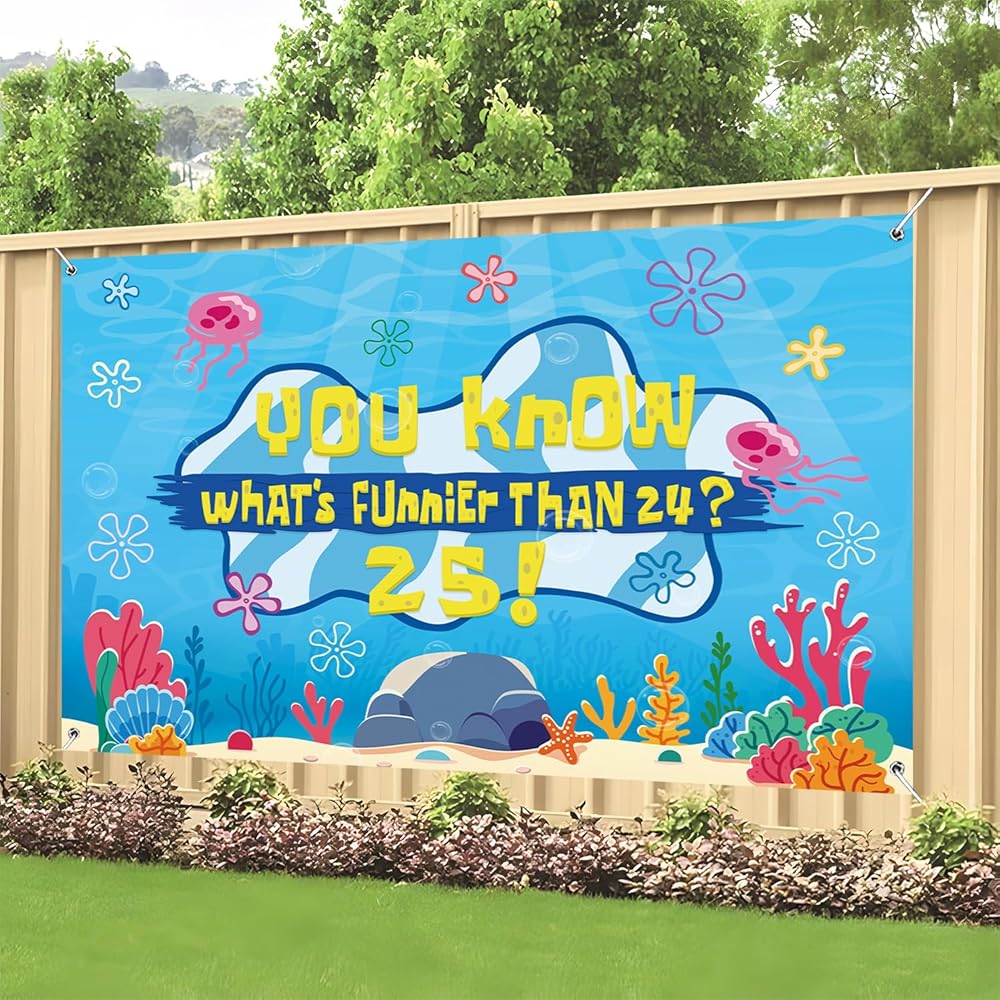 Eye Catching Design: Our birthday decorations backdrop banner adopts the iconic blue tone of the beach and combines classic patterns such as jellyfish, starfish, seaweed and coral with the humorous celebration text "You know what's funnier than 24? 25!". The prints are bright and vivid, presenting the underwater world in a lifelike manner