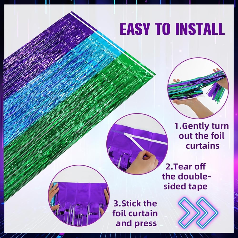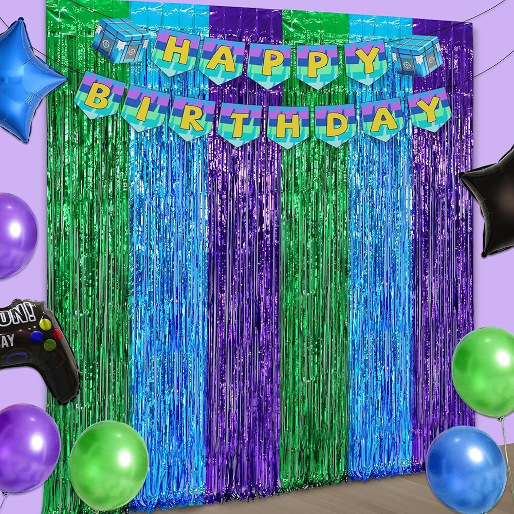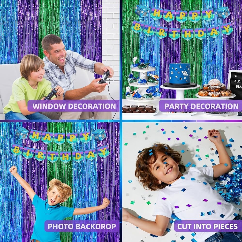 • ديكور متعدد الاستخدامات لأي مساحة للاعب: ديكورات عيد ميلاد ألعاب الفيديو تخلق خلفية كشك الصور النهائية لزخارف حفلة عيد ميلاد الألعاب التي لا تنسى. بعد الحفلة ، تعتبر الستائر الخلفية الخضراء الخضراء والأزرق والأرجواني المتلألئة مثالية لخلفية البث المباشر أو جدار صورة غرفة اللعبة أو ديكور ديناميكي لطاولة أو مرحلة حلوى.