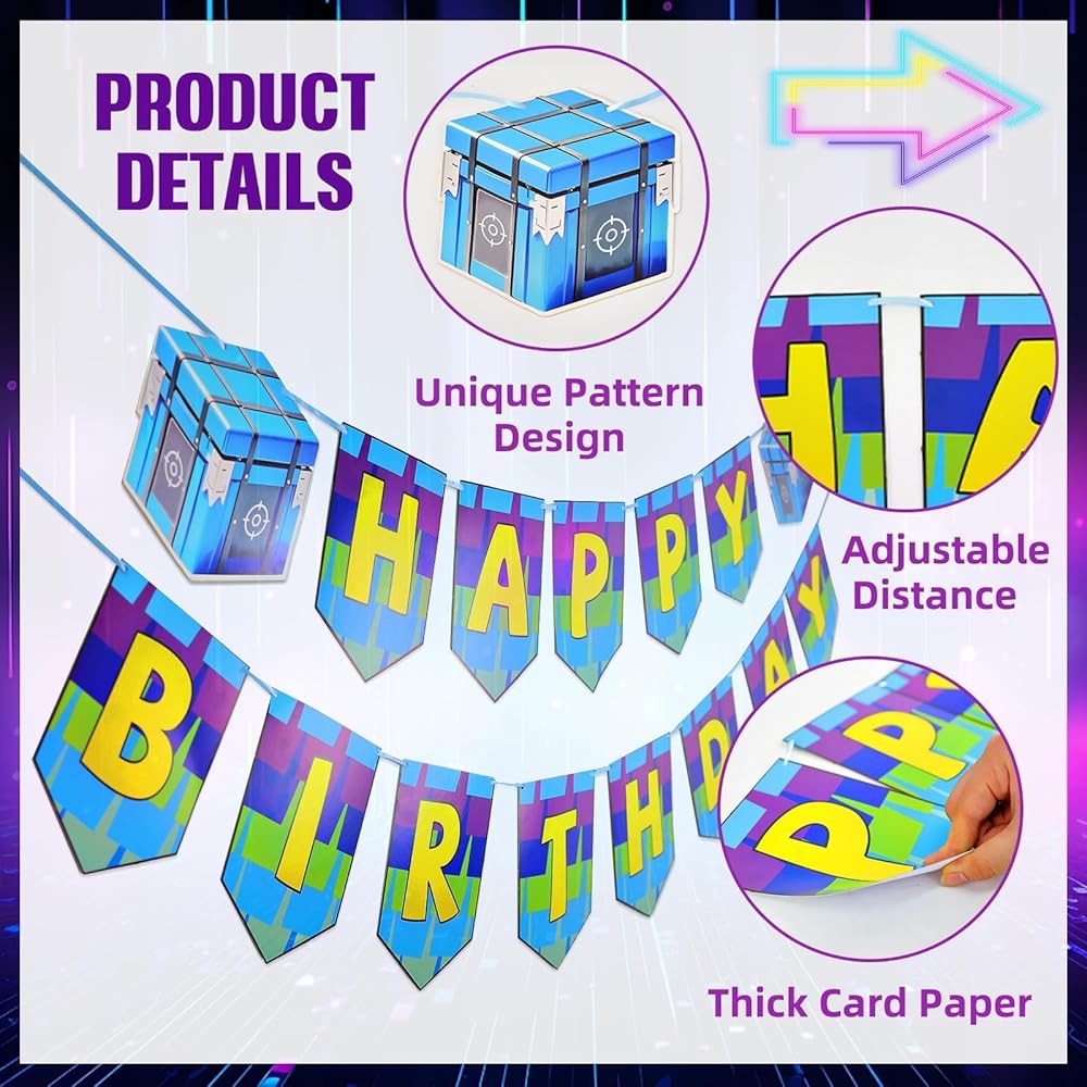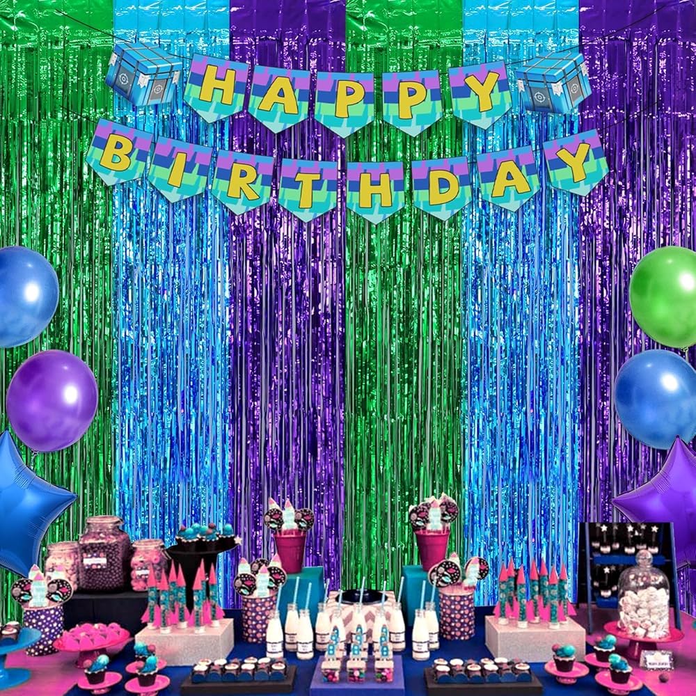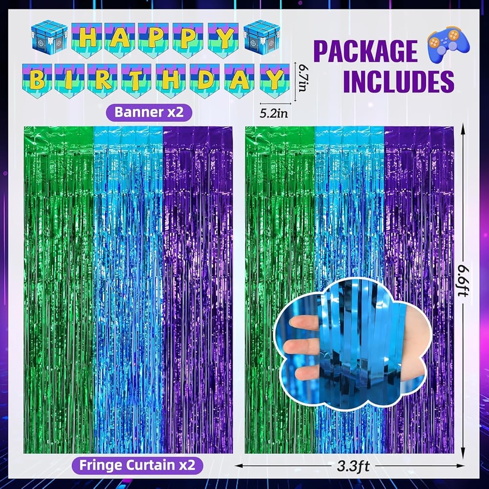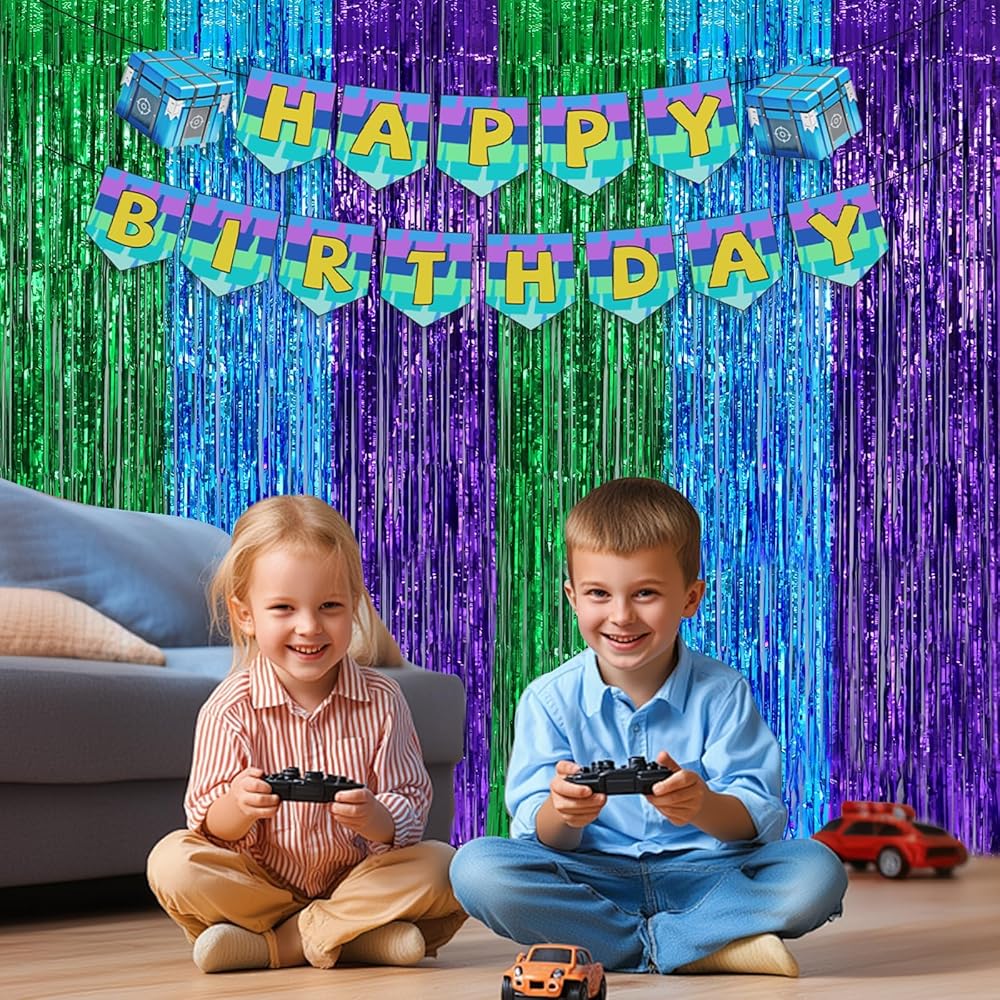 ديكورات عيد ميلاد ألعاب الفيديو ، 2 عبوة خضراء زرقاء أرجوانية ألعاب الستائر الخلفية الهاموب مع 1PCS لافتة حفلة عيد ميلاد للأولاد الأطفال اللاعبين ألعاب ألعاب ألعاب اللاعبين