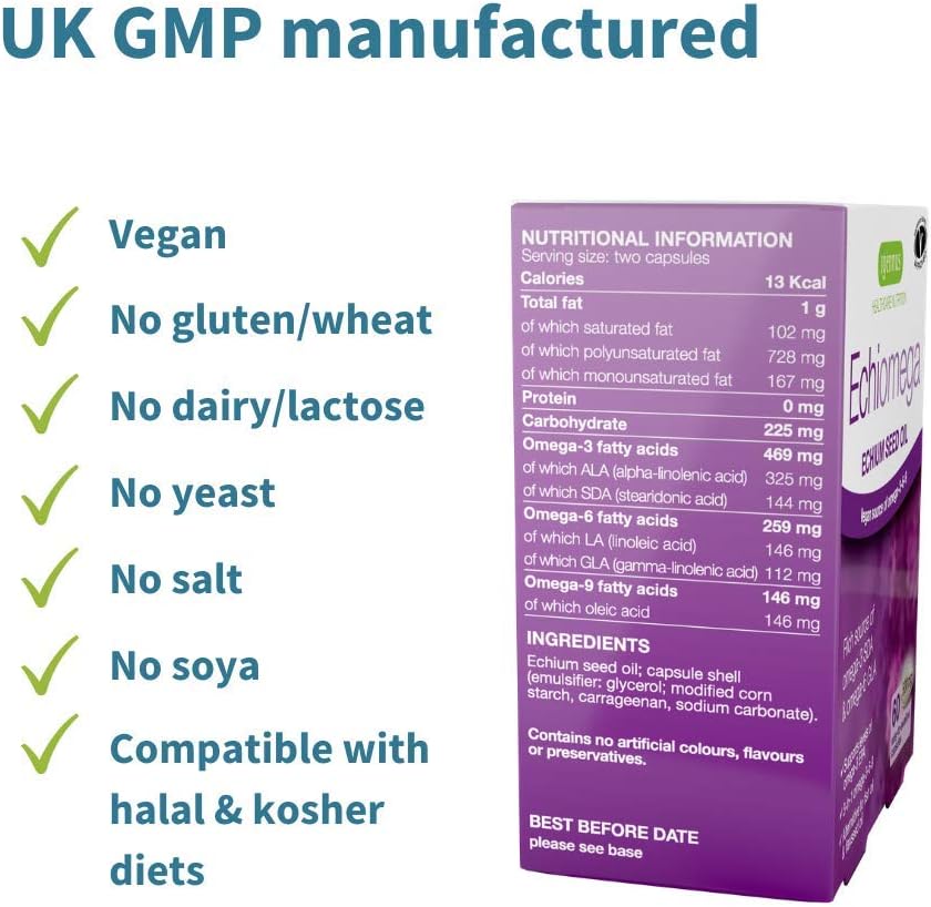 Echium seed oil has a unique Omega-3-6-9 makeup that makes it superior to other commonly available plant oils such as flaxseed. Echium seed oil is rich in a special form of omega-3 called SDA (Steardonic Acid) that is much more easily converted to EPA and DHA - the active long-chain omega-3s in fish oil that offer brain, heart and eye health benefits. In comparison with flaxseed oil, echiomega echium seed oil generates 60 percent more omega-3 EPA in the body. Echium seed oil is also rich in fats typically sourced from other healthy oils. Echium contains the 'good' omega-6 GLA, for which evening primrose oil is sought after, as well as the omega-9 oleic acid - the principal fat in olive oil that is consumed in large amounts in the Mediterranean diet. Offering an optimal balance of omega-3-6-9, echiomega is an excellent plant source of health-enhancing good fats. Echium seed Oil is the ideal nutritional supplement for those who are vegetarian, vegan or allergic to fish, to help boost the levels of the important omega fats in the diet. Each box contains 60 capsules, providing a month supply at a daily dosage of 2 capsules. The dosage can be increased for more intensive support.