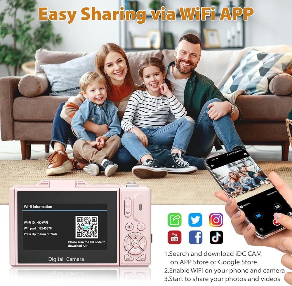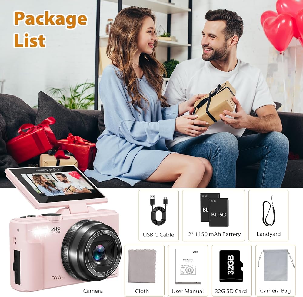 【4K Video Recording with Autofocus & Remote Control】 The Video camera supports 4K video recording, providing smooth, professional-quality video with autofocus to keep your shots clear. Ideal for vloggers or those new to video content creation, this camera is a great way to get started with YouTube vlogging or creating social media content. It also includes a remote control, making it easier to capture stable shots, especially when shooting selfies or using a tripod.