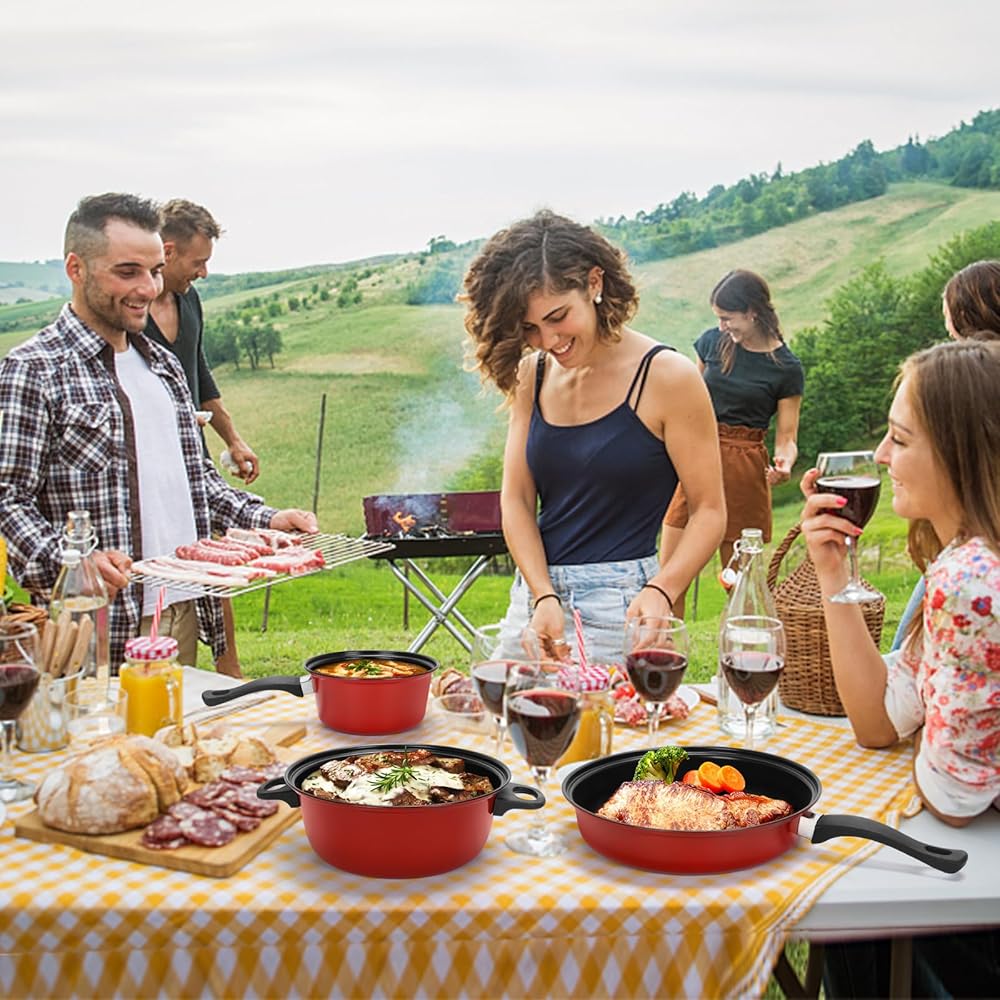 مجموعة أدوات طبخ غير لاصقة ، وأواني محمولة محمولة من الحديد الزهر والأقواس مع أغطية زجاجية وأواني من نايلون 4 قطعة من أجل السفر في الهواء الطلق التنزه