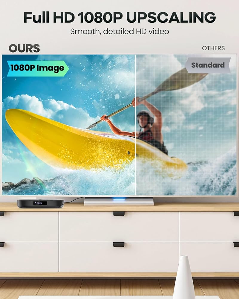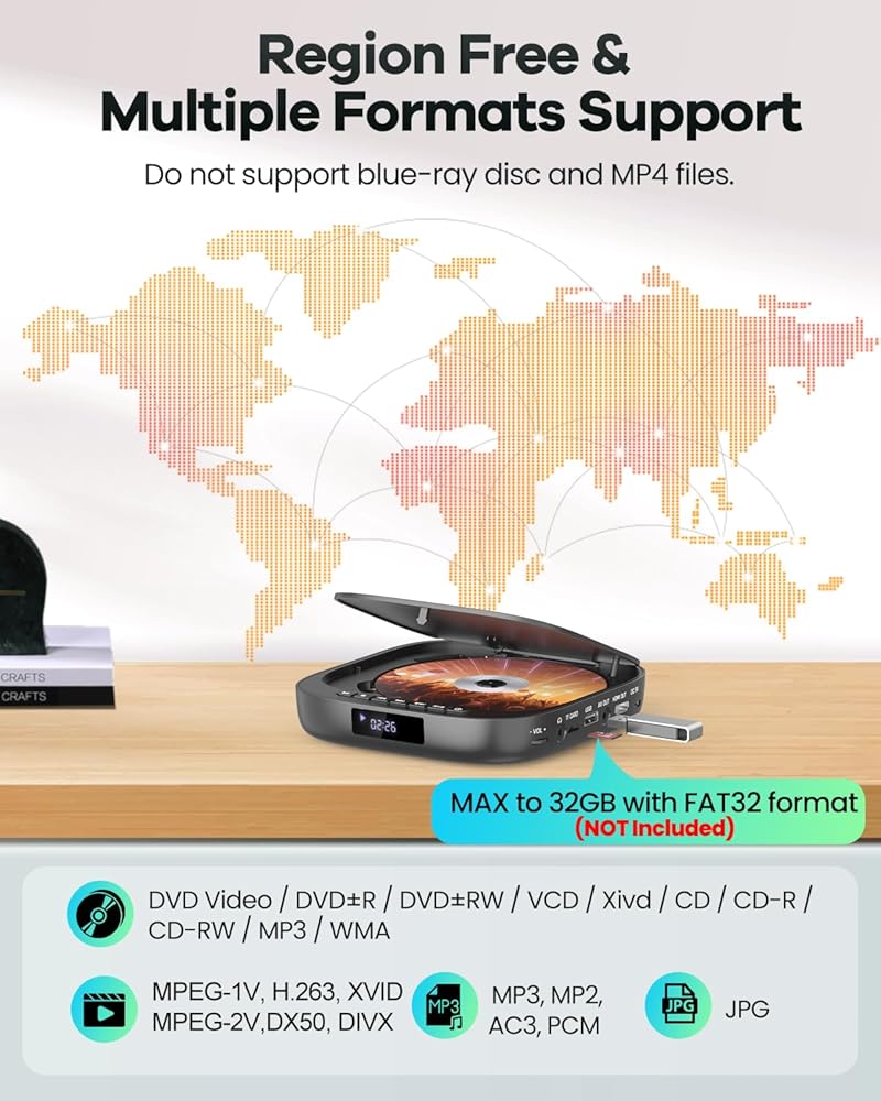 يدعم مشغل DVD في جميع المنطقة بدقة 1080 بكسل HD ، ويدعم تشغيل أقراص DVD من جميع المنطقة ويدعم تنسيقات القرص: DVD ، SVCD ، CD ، MP3 ، Kodak Picture ، Photo CD ، Divx. ملاحظة: لا تدعم أقراص Blu-ray!