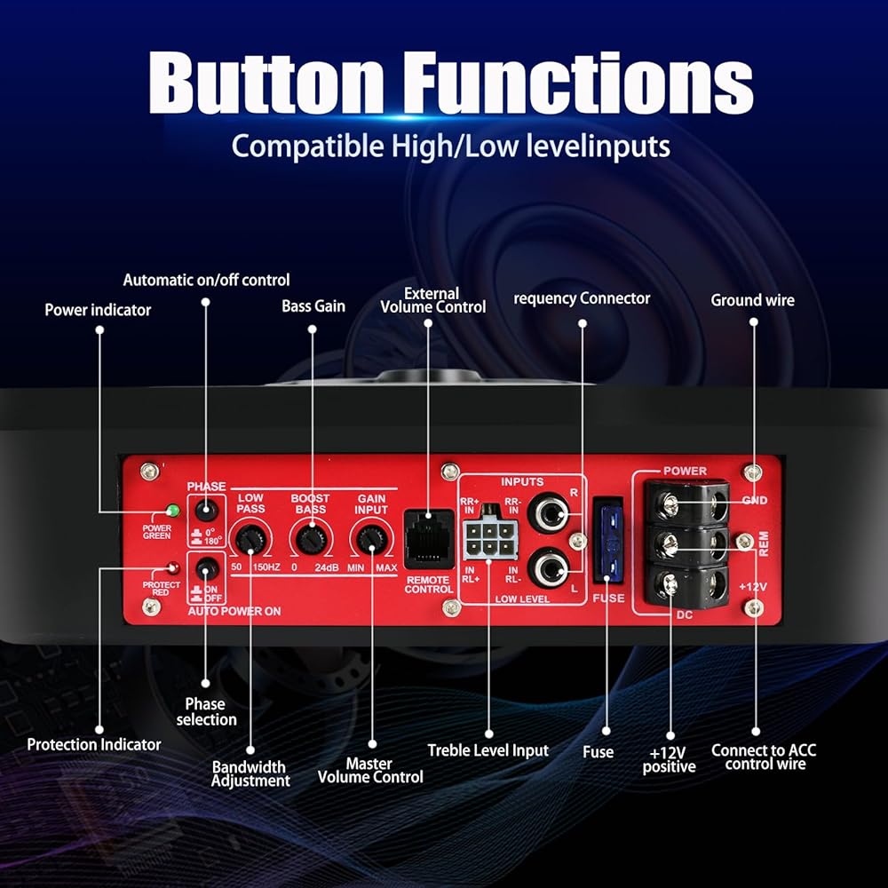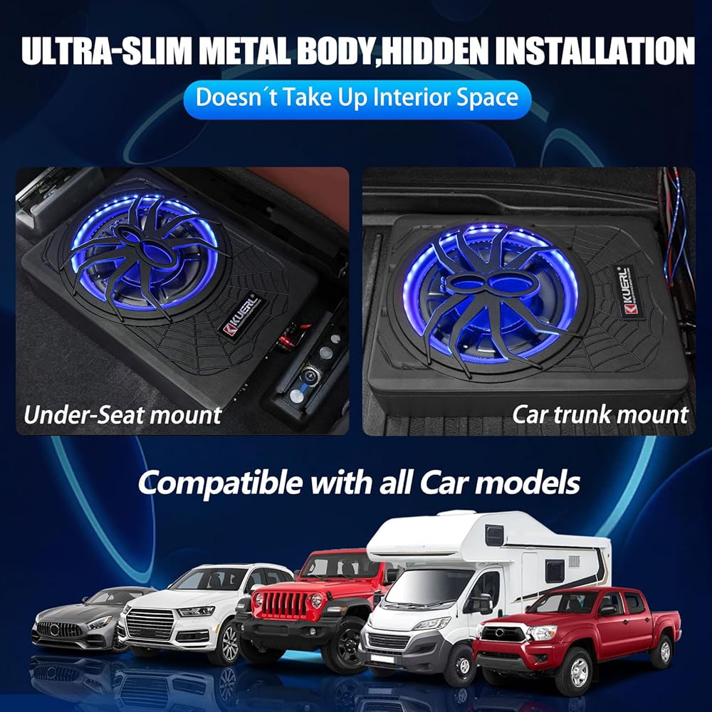 [1000W WAST بحجم 10 بوصة بحجم 10 بوصات مع تبريد متقدم]: تم تصميمه مع حاوية من الألومنيوم المصبوب لتبديد حرارة أسرع 3x مقابل الصلب ، يتناسب مضخم الصوت الفائق بحجم 3.1 بوصة بسلاسة تحت معظم مقاعد السيارة. تقدم برامج تشغيل لفائف الصوت المزدوجة وميناء رد الفعل الدقيق الدقيق بترددات عميقة 20 هرتز-150 هرتز ، مدعوم من 300 واط RMS (1000 واط) من أجل الأداء الخالي من التشويه على محركات طويلة
