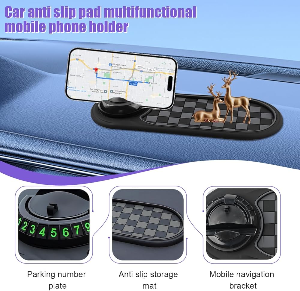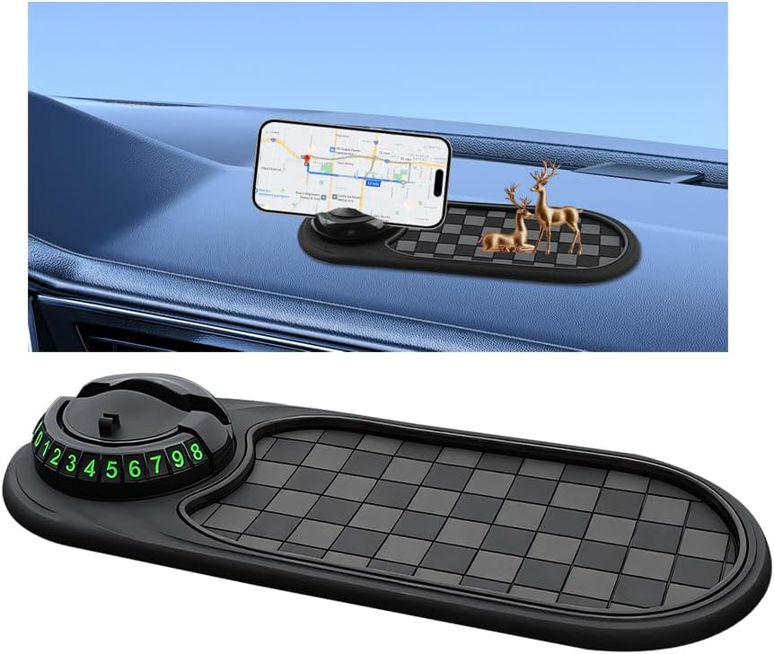 All-in-One: It is a 3-in-1utility tool, including cell phone navigation holder, parking number plate and anti-slip mat. The cell phone holder supports 360 degree rotation, suitable for multi-angle use. The parking number plate is a concealable type and the enlarged font is clearly visible, which can be seen outside the car and hidden to protect privacy when not in use. The non-slip storage mat can store cell phone, keys and other small things, so that the car is neat and orderly.