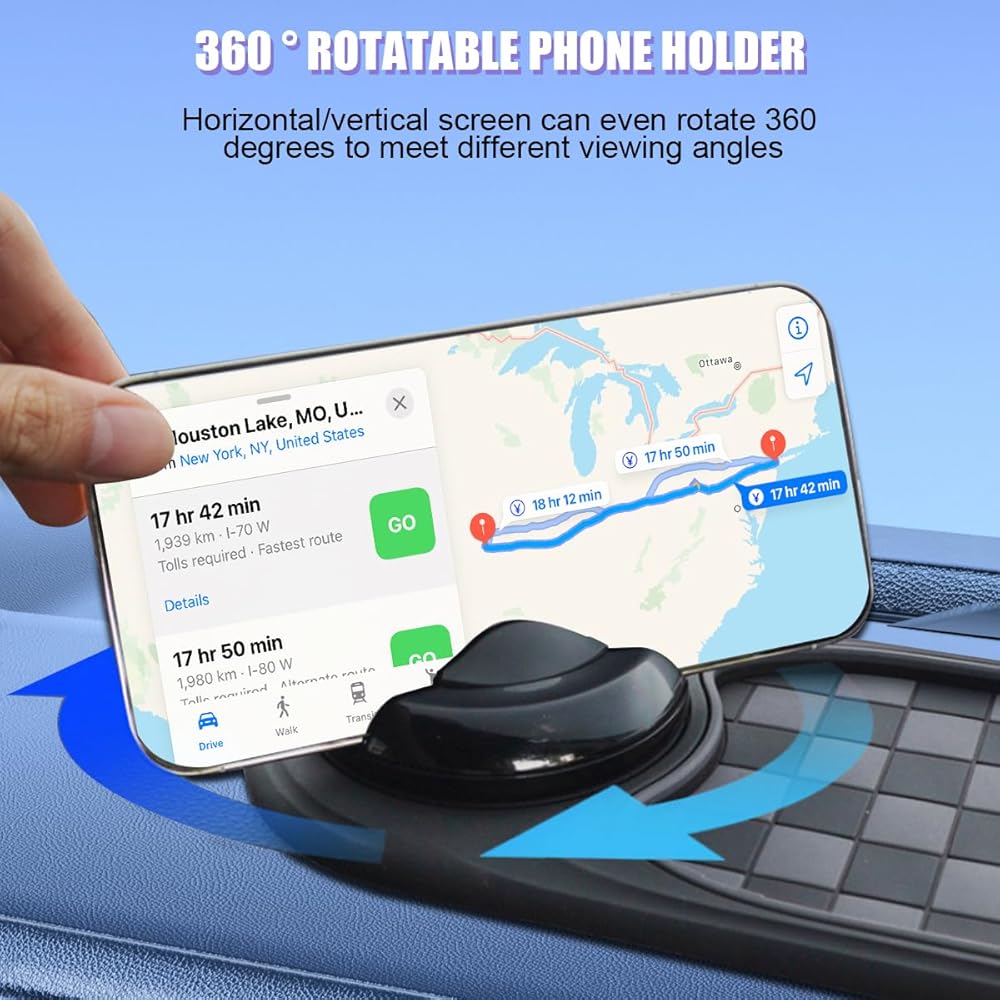 Widely Usage: The car anti-slip mat measures 11.81 x 4.72inches, the diameter of the phone holder is 3.35inches and can opens to 0.67inches, which is universal fit for different car dashboard. The phone holder is equipped with a telescopic spring, no matter the phone is thin or thick, or covered with a heavy protective case, it can be firmly clamped, and it supports 360-degree free rotation, and the horizontal and vertical screens can be switched at will, providing you multi-angle services.