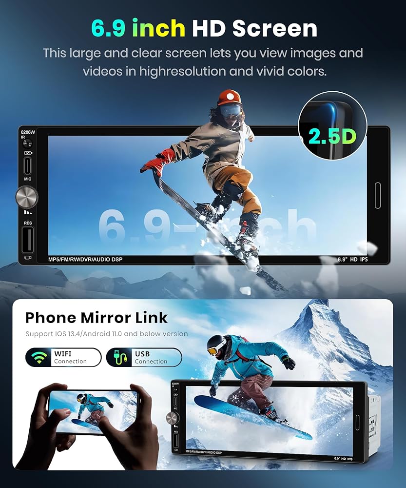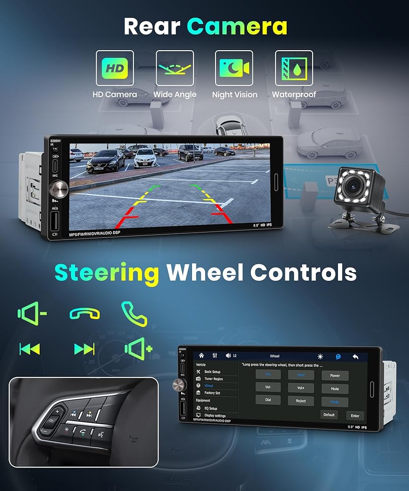 ستيريو سيارة دين واحد مع Carplay اللاسلكي Android Auto-2025 Bluetooth 5.2 Type-C Dual Dual 6.9 بوصة IPS شاشة الراديو مع مرآة كاميرا النسخ الاحتياطي رابط FM USB EQ SWC