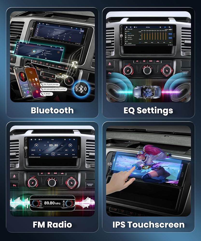 【5.2Bluetooth & FM Radio & Eq】 Bluetooth 5.2 يتيح الاقتران السريع والمستقر للموسيقى ومزامنة الاتصال. يدعم ستيريو سيارة Bluetooth هذا تشغيل الموسيقى ، والمكالمات الخالية من اليدين ، و Access.