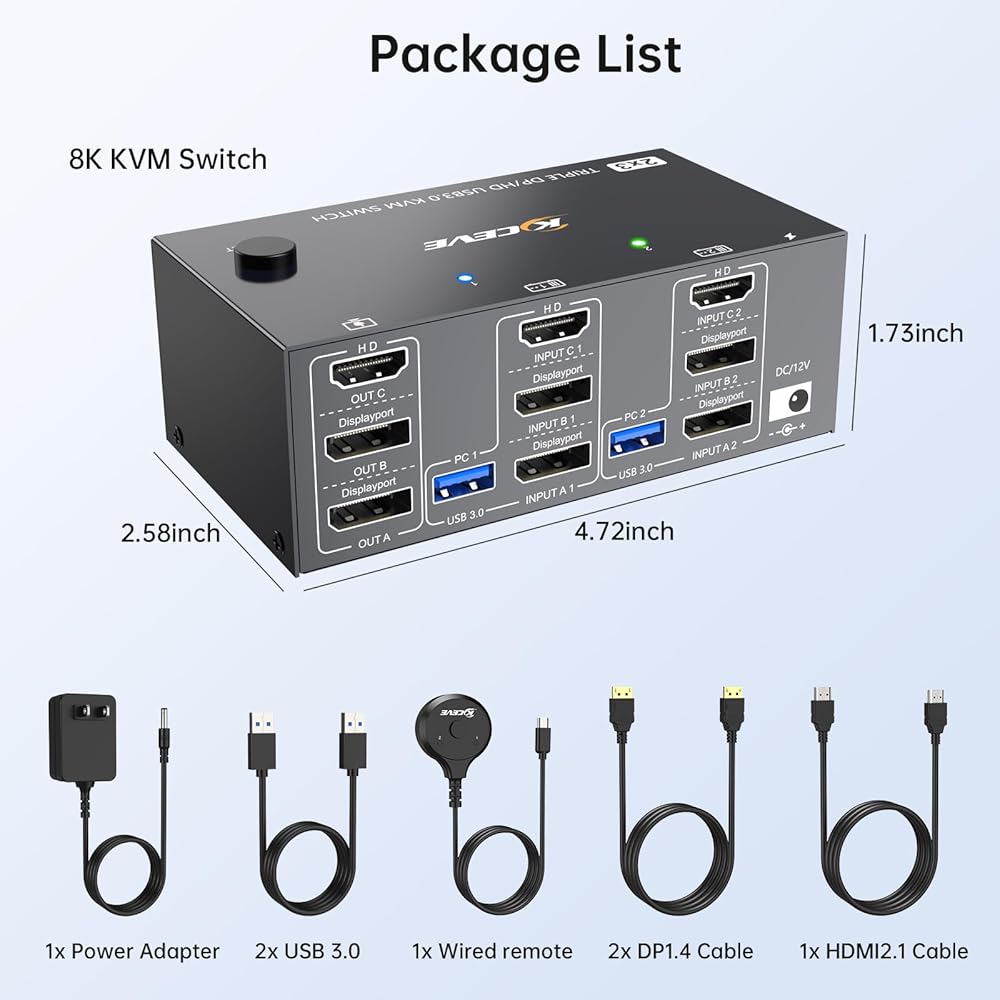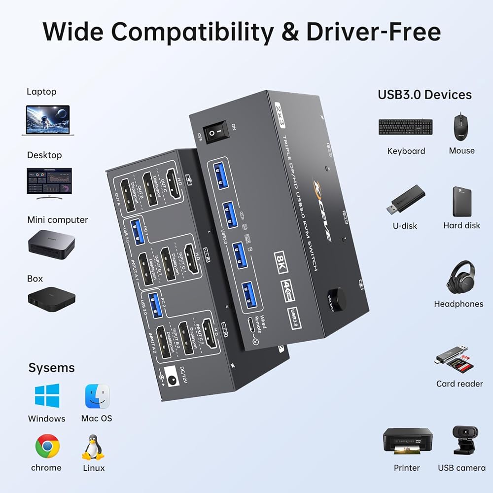 【Ultra 8k 3 Monitor KVM】 8K 2 DisplayPort HDMI KVM Switch 3 مراقبين 3 مراقبين أجهزة الكمبيوتر الدقة 8K/4K وتوافق مع الخلف مع دقة أقل ، فهو يوفر صورة عالية التعريف ، DP ، HDMI2.1 و DP1.4 كابلات ، طول الكابيل أكثر قصرًا.