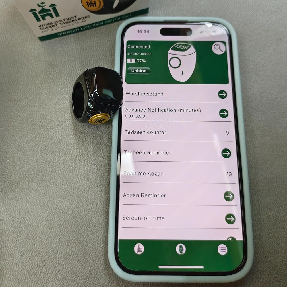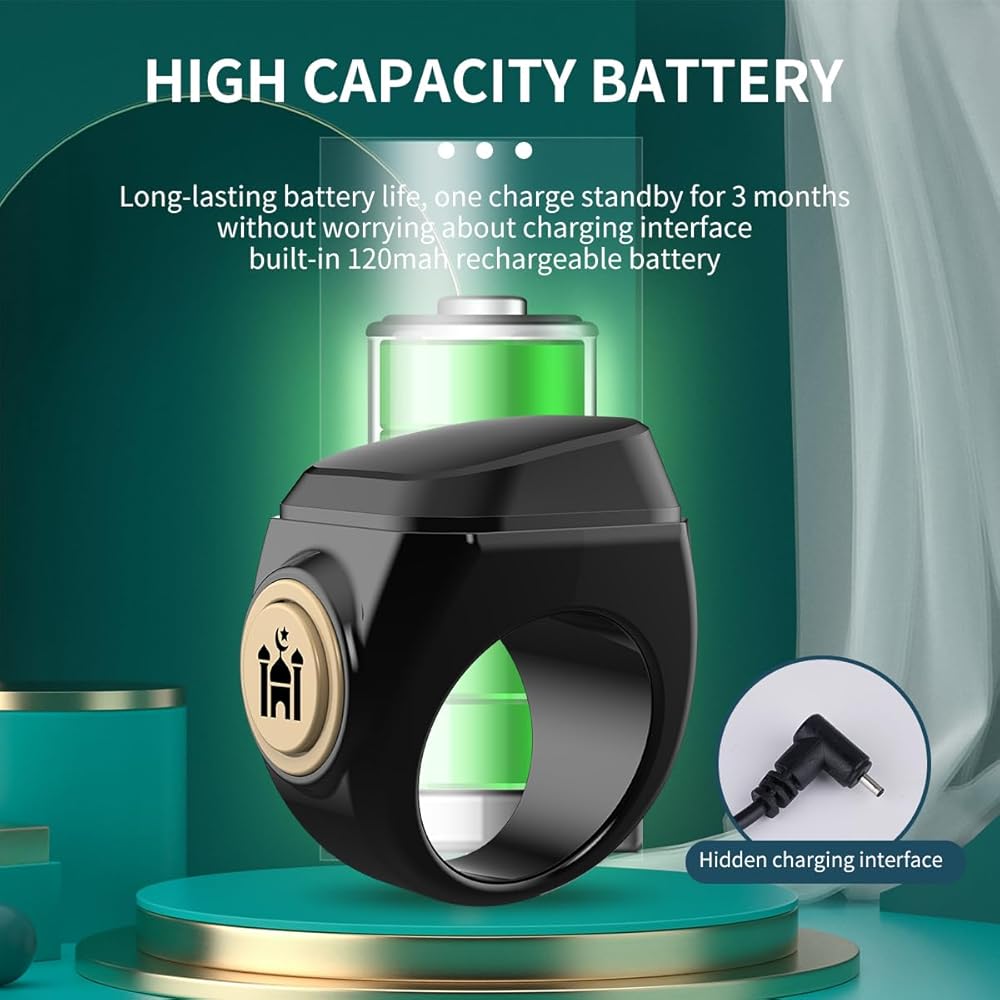 Smart Zikr Ring with Azan Alarm & Vibration Reminder:This innovative digital Tasbih ring features an azan prayer reminder, vibration alerts, and Bluetooth connectivity, helping you stay on track with your 5 daily prayers and dhikr sessions.