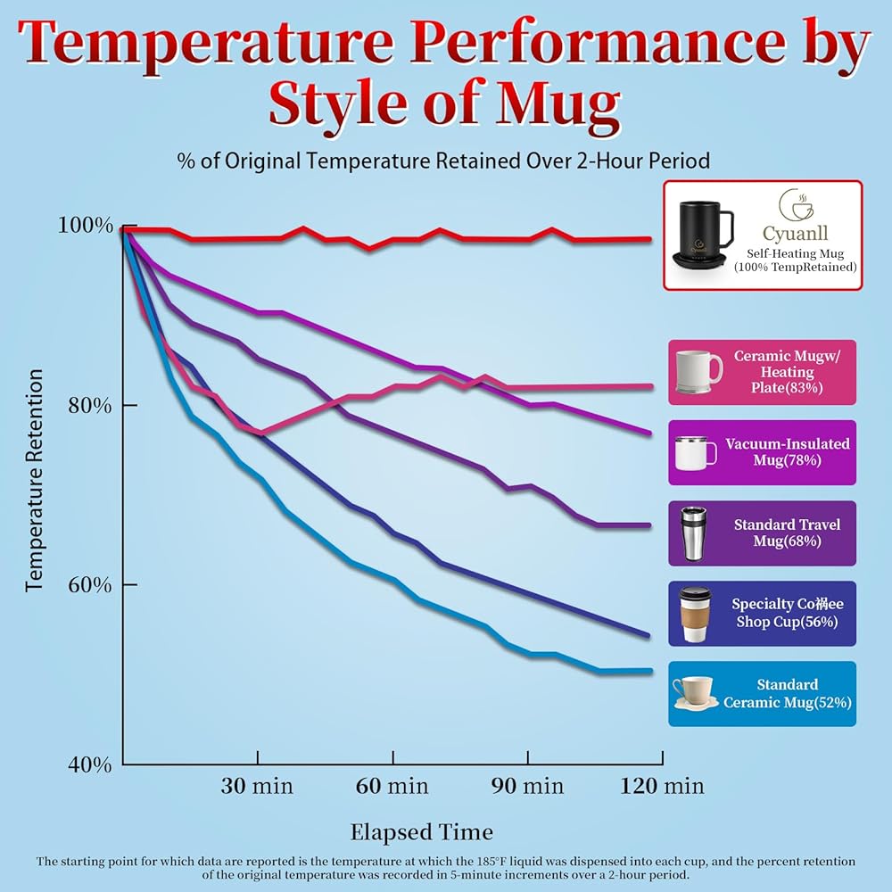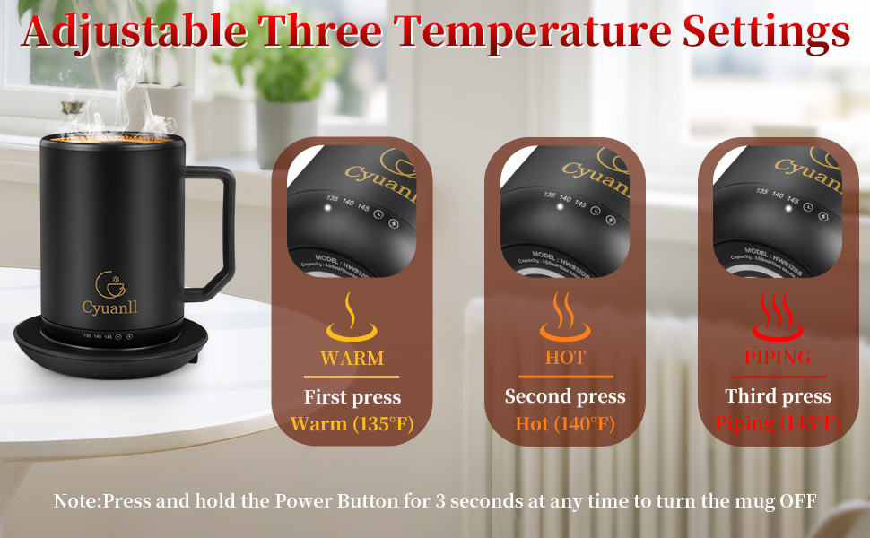 عمر البطارية الطويل للغاية-يستخدم كوب القهوة Cyuanll Warmer بطارية عالية الجودة ، والتي يمكن أن تبقي مشروبك ساخنًا في درجة الحرارة المثالية (135 درجة فهرنهايت -45 درجة فهرنهايت) من 60 دقيقة إلى 150 دقيقة (أطول مع الغطاء) عند شحنها بالكامل ، حتى عند عدم وضعها على شحن الشحن. ضع فنجان القهوة على السفينة القابلة لإعادة الشحن للتدفئة غير المحدودة. يمكنك الاستمتاع بمشروب دافئ في أي وقت وفي أي مكان.