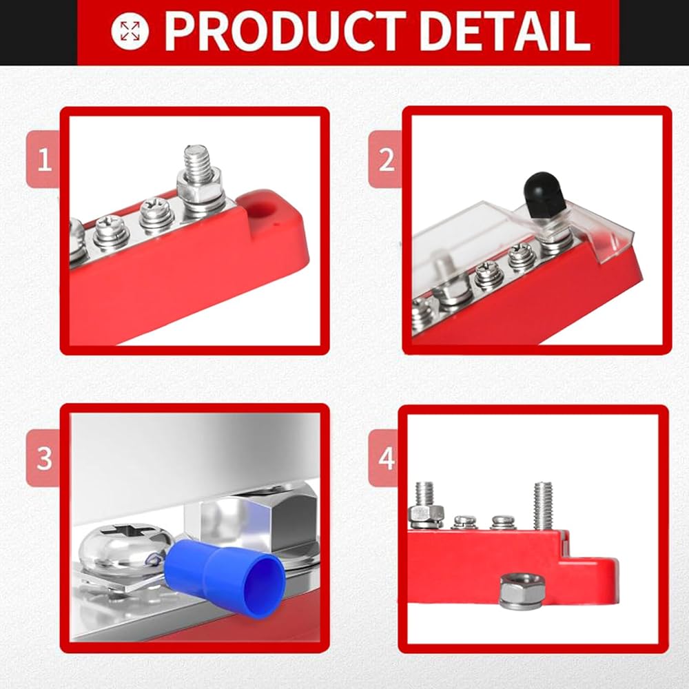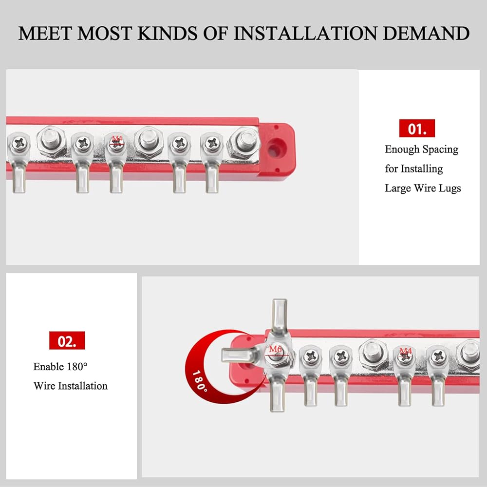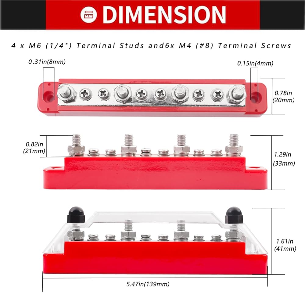 معلمات المنتج: كتلة توزيع الطاقة 12V 150A 4 × 1/4 "(M6) مسامير ، 6 X #8 (M4) محطات مسامير.