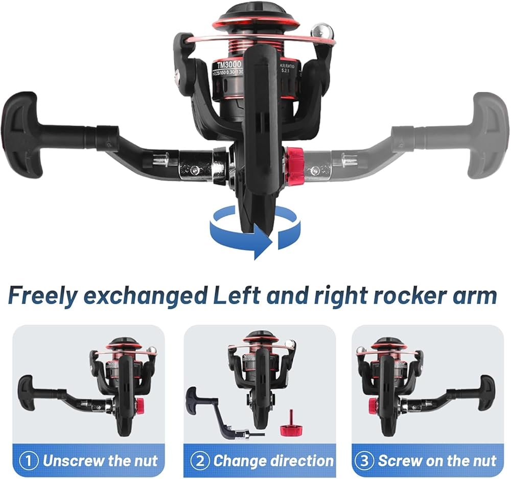 【بكرة صيد ناعمة】 بكرة الغزل TM3000 تتميز بكرة ألمنيوم قوية وتصميم قابلة للطي ، يتمتع المقبض المعدني بنسبة تروس وتروس دقة 5.2: 1 ، مما يجعلها قوية للغاية.